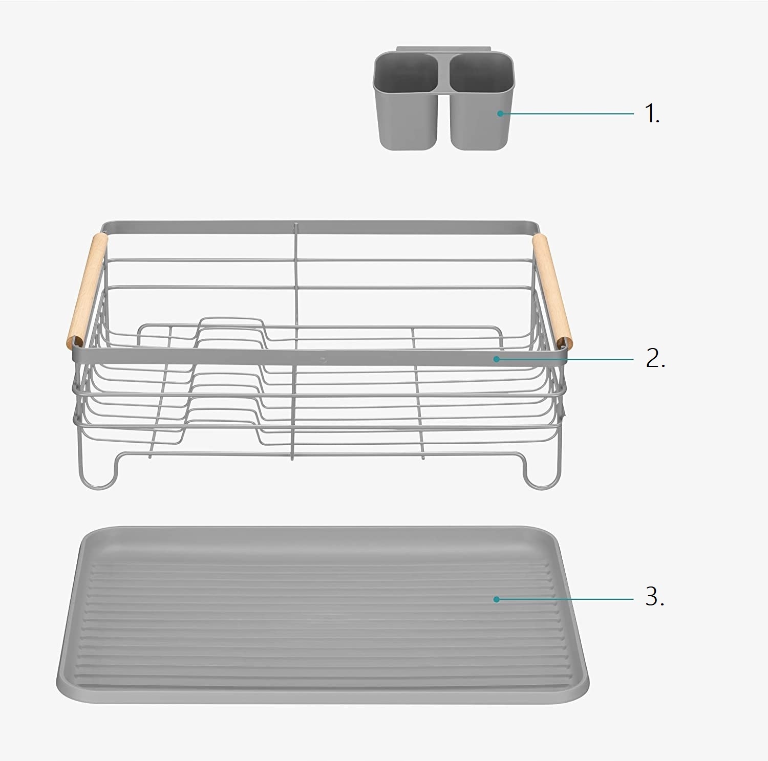 Сушка для посуду характеризується високою якістю та міцною металевою конструкцією. Піддон зі смоли захищає стільницю від намокання. У комплект також входить пластикова ємність для столових приборів на два відділення. Металева сіра стійка для сушіння з дерев’яними ручками підходить для будь-якої кухні.