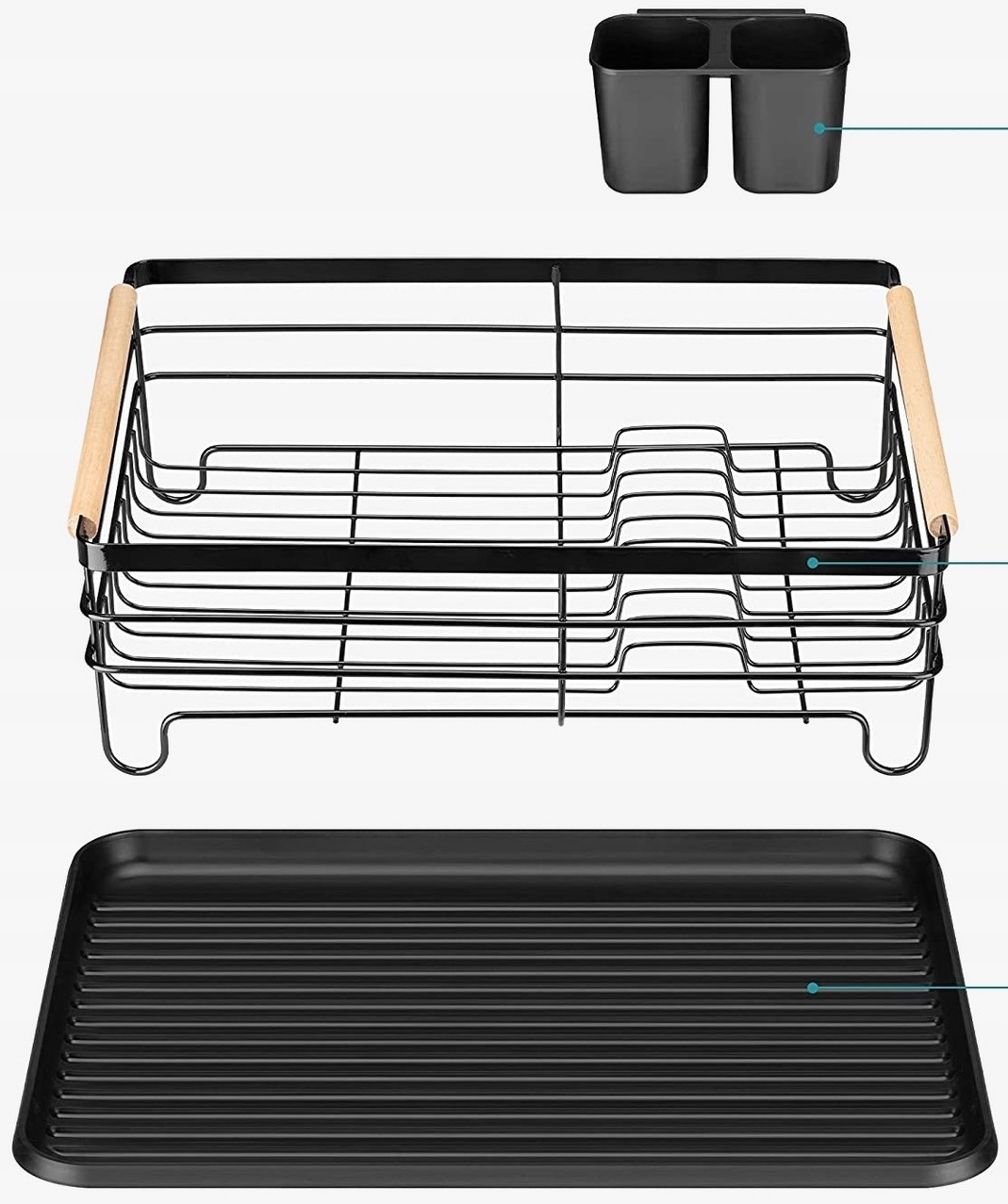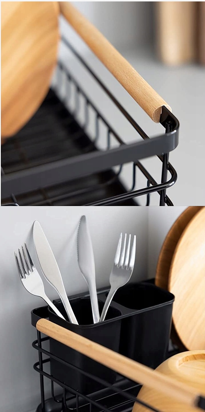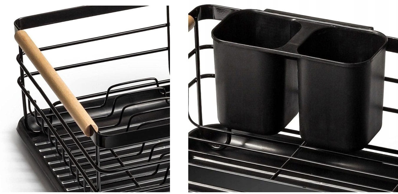 ✅Сушка для посуду характеризується дуже високою якістю та міцною металевою конструкцією. Смоляний піддон захищає стільницю від намокання. У комплект також входить пластикова двокамерна сушарка для столових приборів. Металева чорна сушарка з дерев’яними ручками – елегантне рішення для будь-якої кухні.