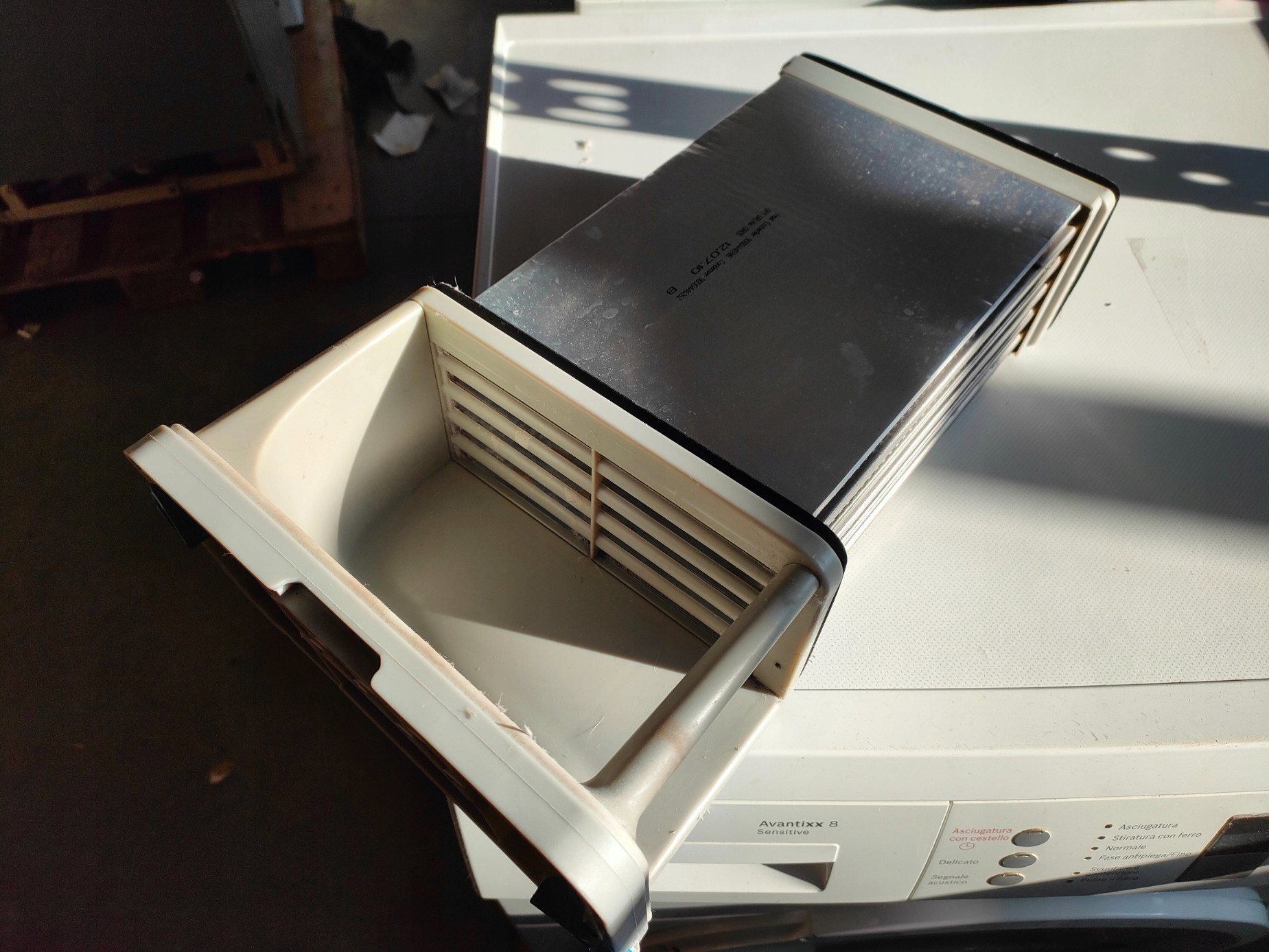 Сушильна машина запускається після підключення до джерела живлення (внутрішня частина барабана нагрілася), всередині пристрою велика кількість ворсинок, немає фільтра, панель італійська, немає інструкції, на решітці, що закриває фільтр, одна засувка зламана, контейнер для ворсу розірваний знизу, в деяких місцях видно подряпини / вм'ятини / невеликі вм'ятини
