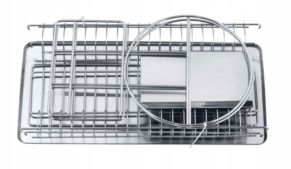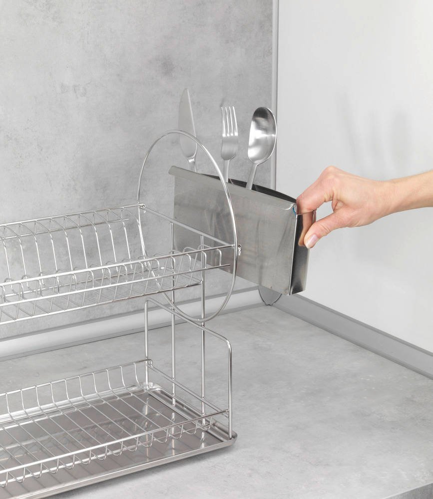 Сушка для посуду з високоякісної нержавіючої сталі полегшить сушіння вимитих вручну столових приборів, тарілок і чашок і захистить кухонну стільницю від бризок. Сушарка для посуду дуже містка - має цілих 2 рівняі спеціальний контейнер для вилок, ножів і ложок. Сушильна машина також має дві ручки, які полегшують її перенесення. Крім того, він характеризується елегантним дизайном і добротністю виготовлення. У складеному вигляді сушка для посуду займе мало місця.