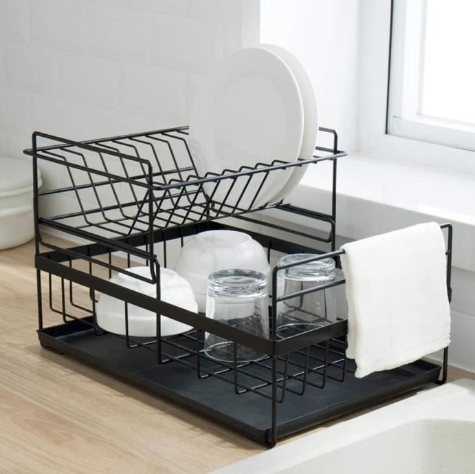 Металевий, чорний каркас ідеально впишеться в будь-який сучасний і класичний інтер'єр. Сушарка має закруглені та гладкі краї, що робить її безпечною та зручною у використанні. Вся металева конструкція пофарбована порошковою фарбою в єдиний колір - чорний. Все це чудово виглядає на кухні і відмінно виконує свої функції. Посуд швидко висихає на сушці, а завдяки подушечці для збору води її можна розмістити практично будь-де.