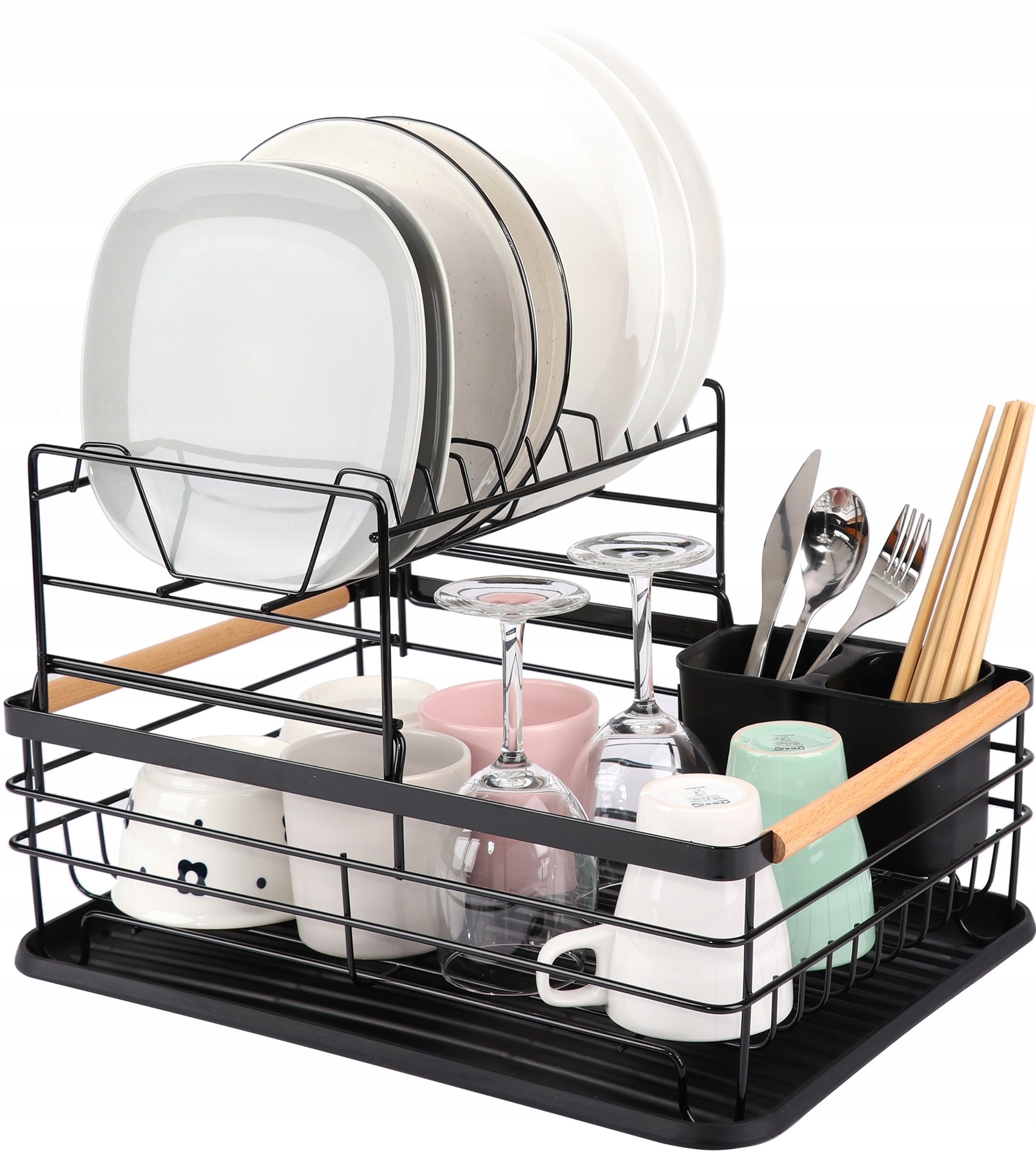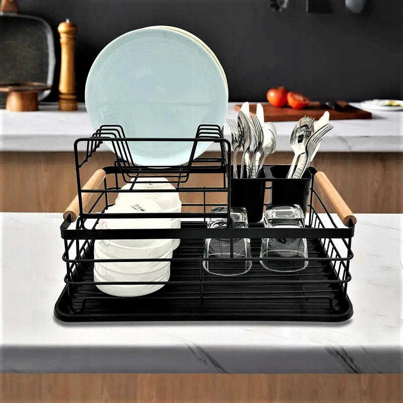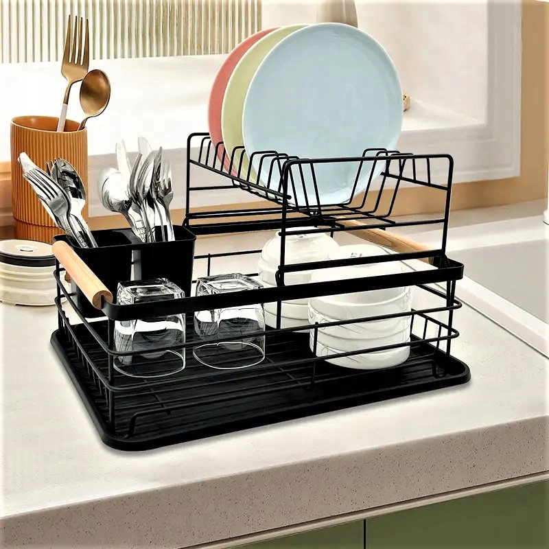 ✅Сушка для посуду характеризується дуже високою якістю та міцною та металевою конструкцією. Смоляний піддон захищає стільницю від намокання. У комплект також входить пластикова двокамерна сушарка для столових приборів. Металева чорна сушарка з дерев’яними ручками – елегантне рішення для будь-якої кухні.
