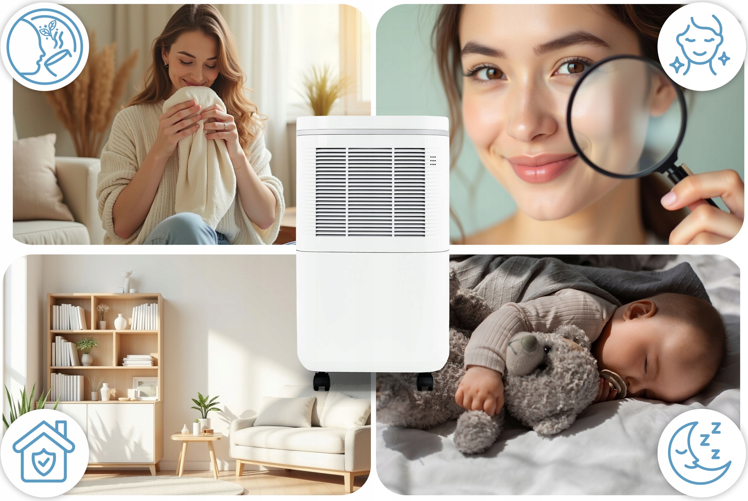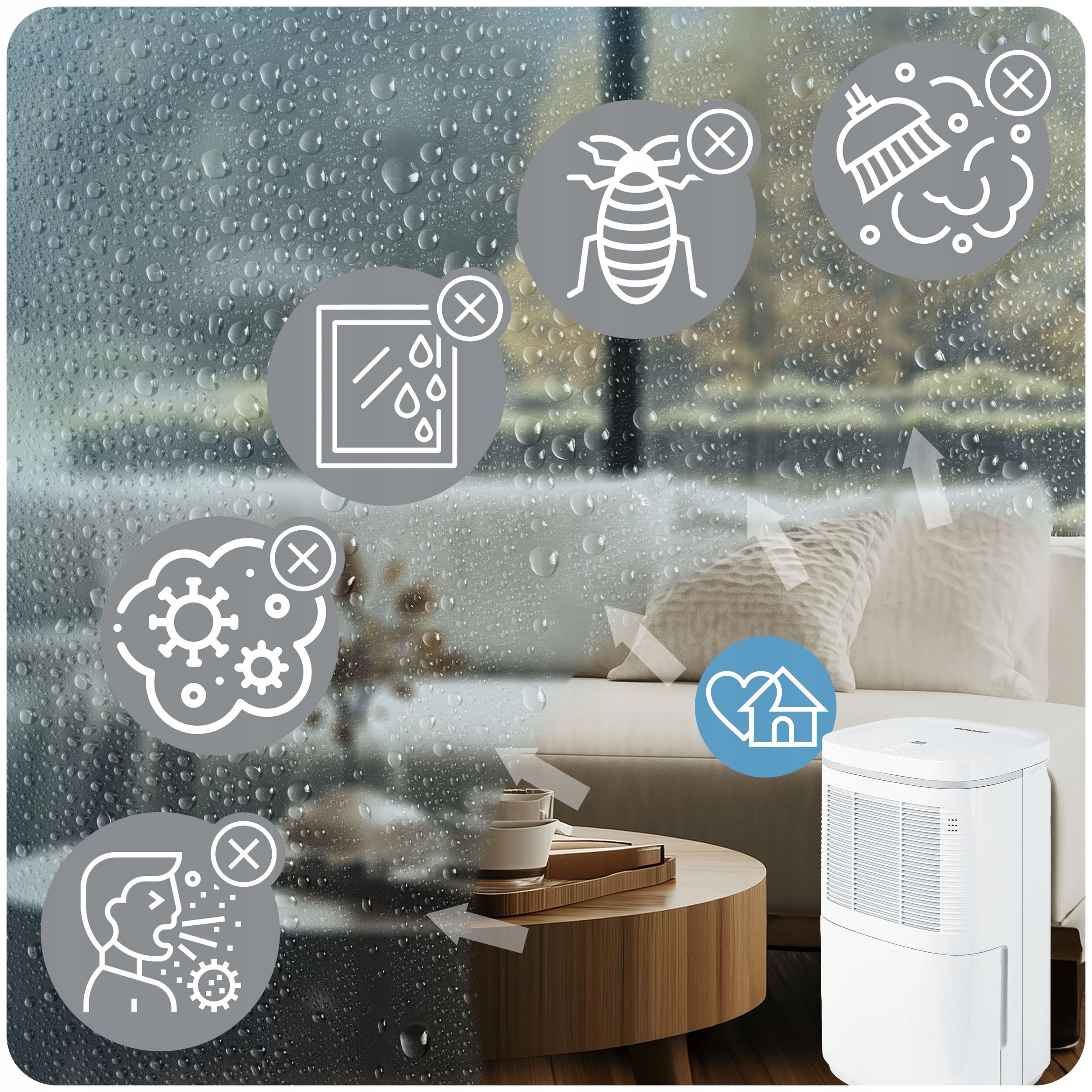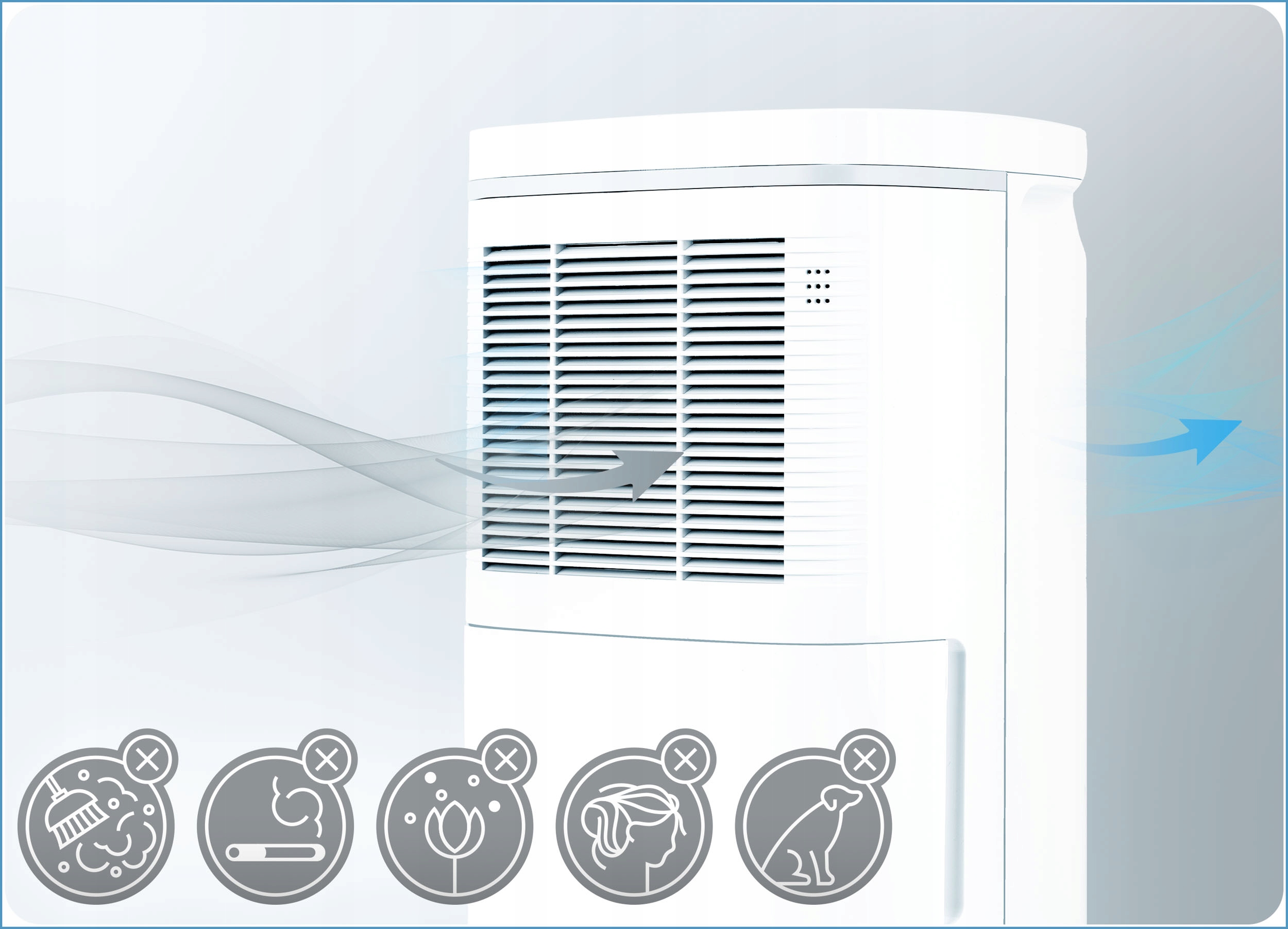 - Скорочує час висихання одягу – осушувач інтенсивно осушує повітря, прискорюючи природний процес випаровування вологи з білизни.