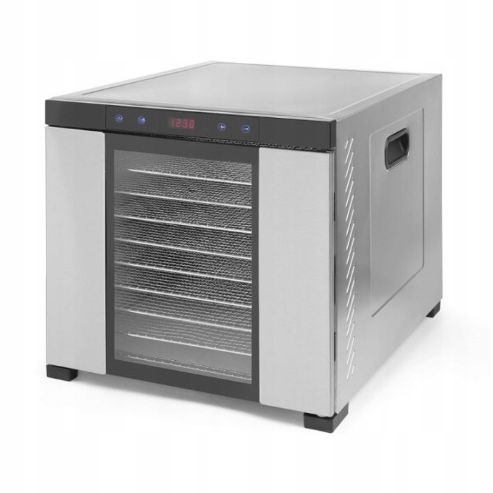 Сушарка для їжі Profi Line Hendi. Корпус з нержавіючої сталі. Для сушіння фруктів, овочів, трав, м’яса, риби тощо. Тепле повітря, що розподіляється тихим вентилятором, забезпечує рівномірний ефект сушіння без необхідності обертання лотків. У комплект входить 10 решіток з нержавіючої сталі розміром 39,5 × 39,5 см. Прозорі дверцята дозволяють спостерігати за процесом сушіння.