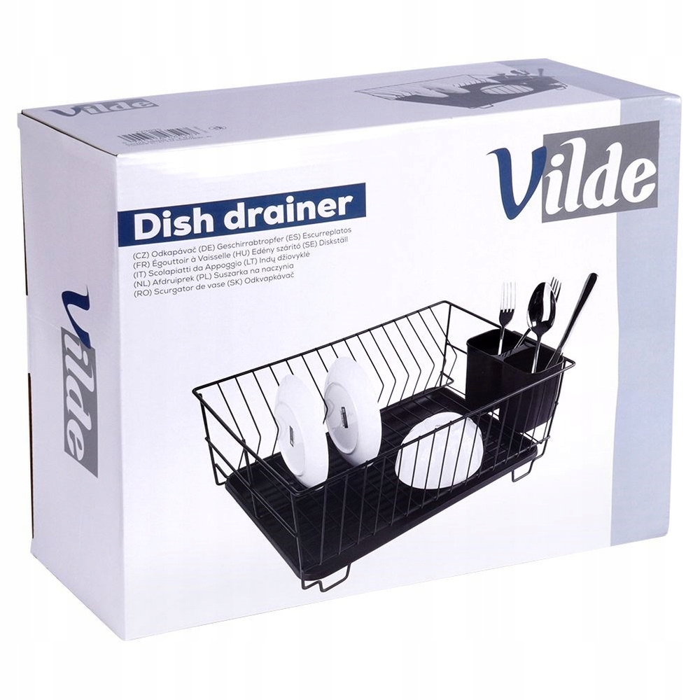 Компактна сушарка для посуду з місцем для тарілок і столових приборів. Виготовлений з міцних матеріалів. Завдяки цьому ви забудете про неприбраний посуд і мокрі сліди на верхній частині шаф біля мийки. Сушильна машина є обов'язковим елементом кухонного обладнання. Виконана в елегантному стилі і в той же час функціональна. Легко чистити. Він має знімний піддон для крапель, тому підтримувати його в чистоті не проблема. Оригінальна продукція Vilde. Виготовлена відповідно до європейських стандартів.