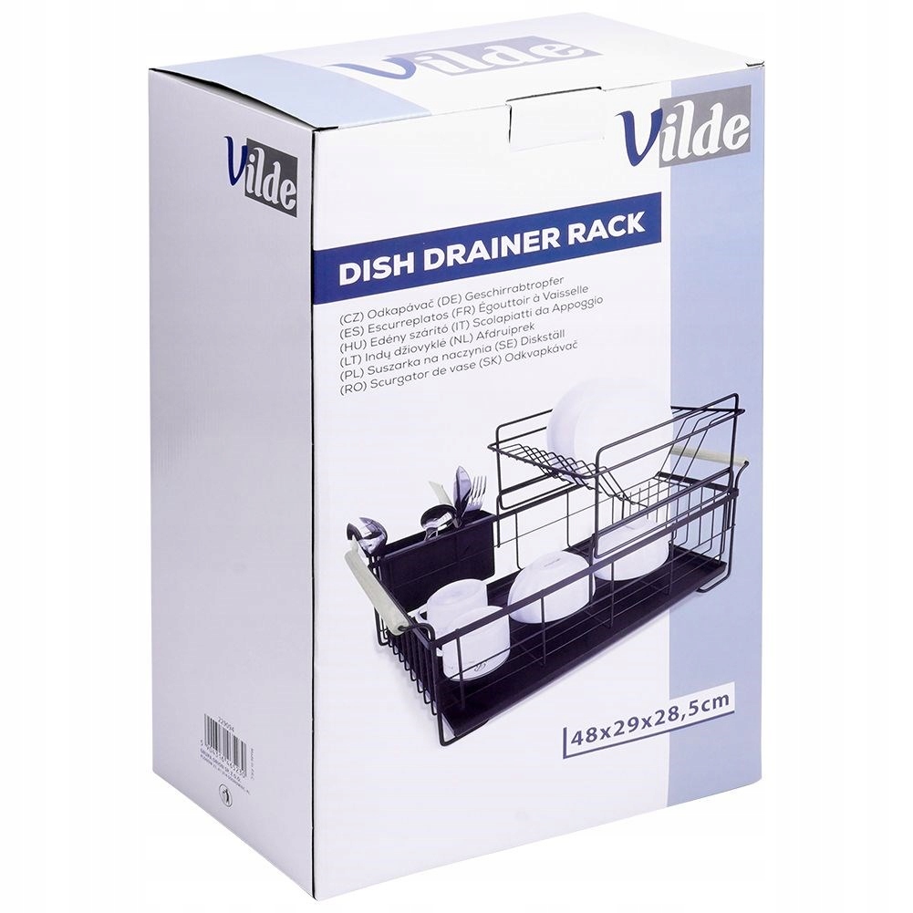 Дворівнева компактна сушарка для посуду з місцем для тарілок, столових приладів та іншого посуду. Виготовлений з міцних матеріалів. Завдяки цьому ви забудете про неприбраний посуд і мокрі сліди на верхній частині шаф біля мийки. Сушарка дозволяє сушити посуд одночасно на двох різних рівнях. Він надзвичайно місткий, оскільки в ньому є місце для тарілок, чашок, столових приборів та іншого посуду. Крім того, він має знімний піддон для крапель, тому підтримувати його в чистоті не проблема. Оригінальний продукт Vilde. Вироблено відповідно до європейських стандартів.