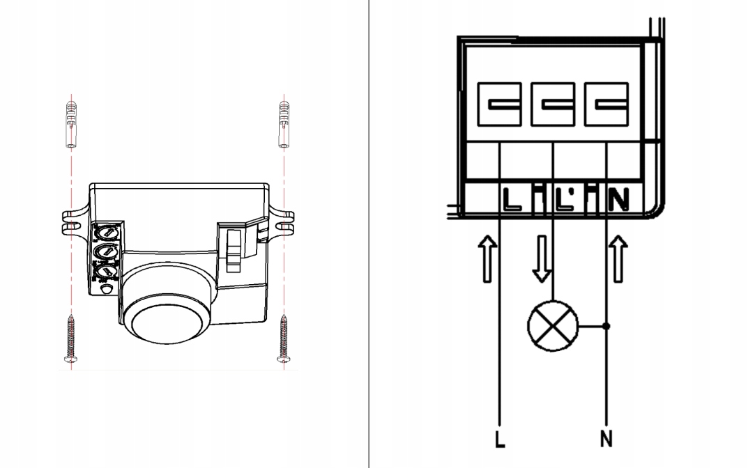 Випромінювання низької потужності (<0,2 мВт), потенціометри для регулювання: часу освітлення, діапазону виявлення руху та чутливості до інтенсивності світла .