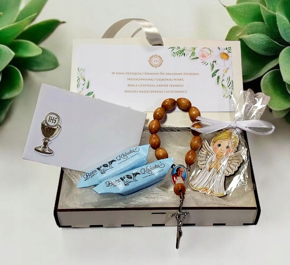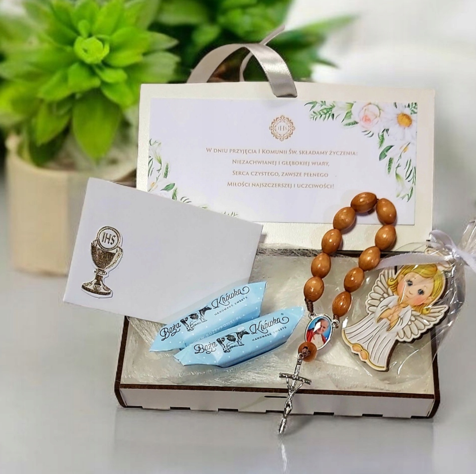 Представляємо унікальну коробочку, ідеальну для подарунку, яка стане чудовим сувеніром - Першим Святим Причастям. Всередині коробки вклеєна вкладиш з побажаннями. Додатково до коробки додається дюжина Розарію, конверт із євхаристійним символом для банкнот, God's fudge – цукерки з помадкою, загорнуті в папірці з цитатами святих, та магніт у формі Янгола для дівчинки чи хлопчика.