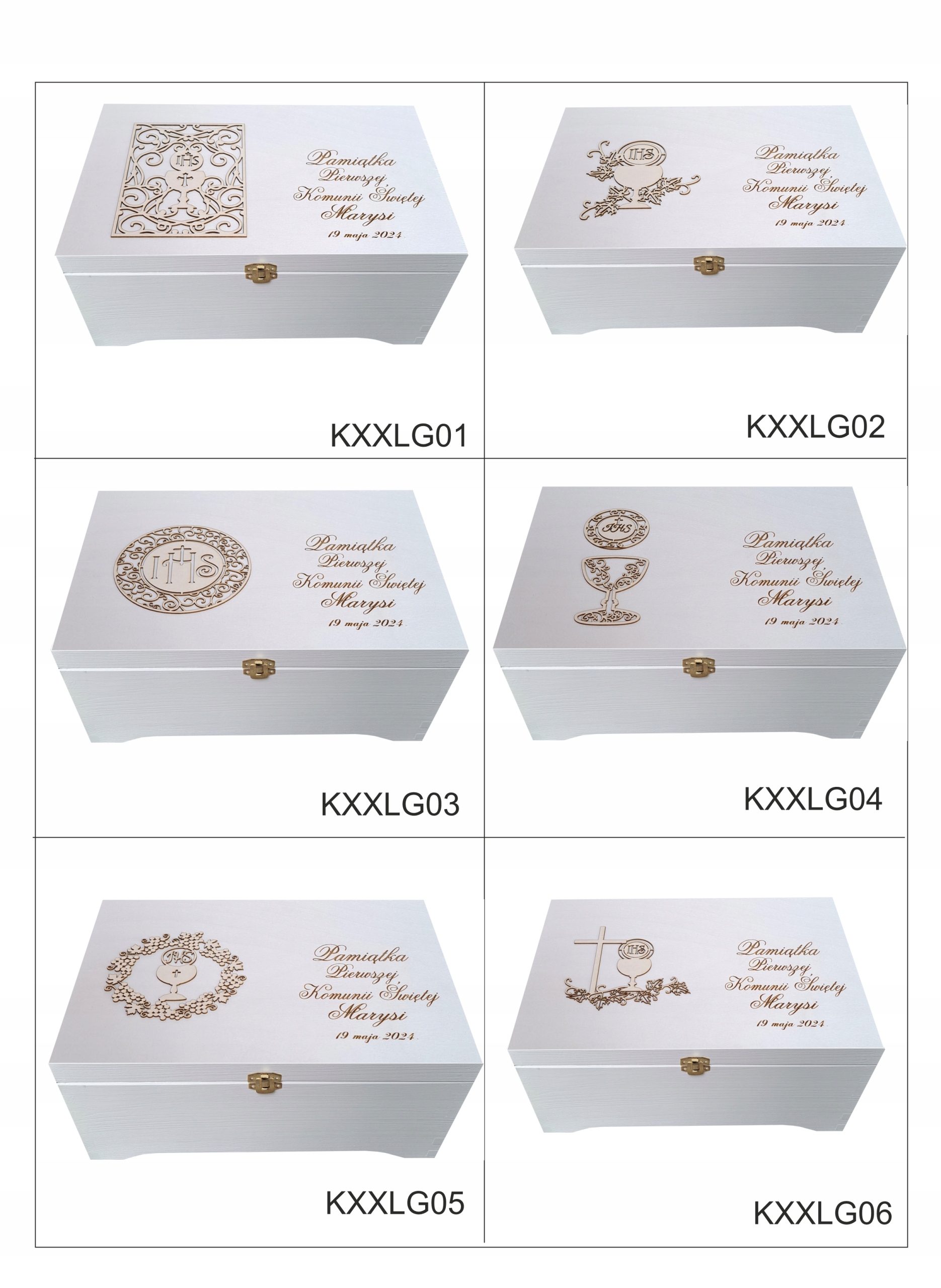 Кришка коробки була пофарбована в білий колір, а його декоративний елемент - це декор, що посилається на подію першого Святого Причастя.