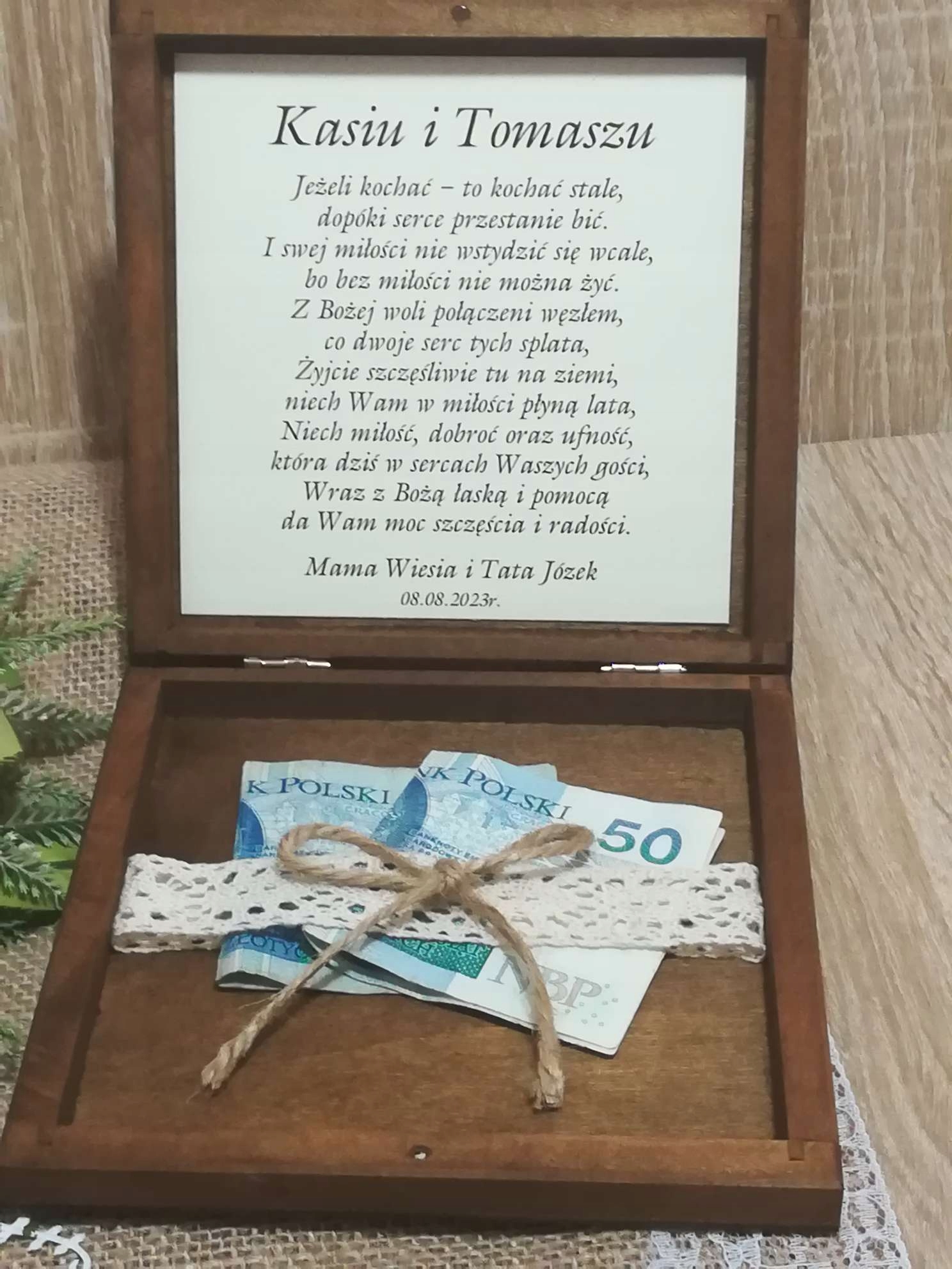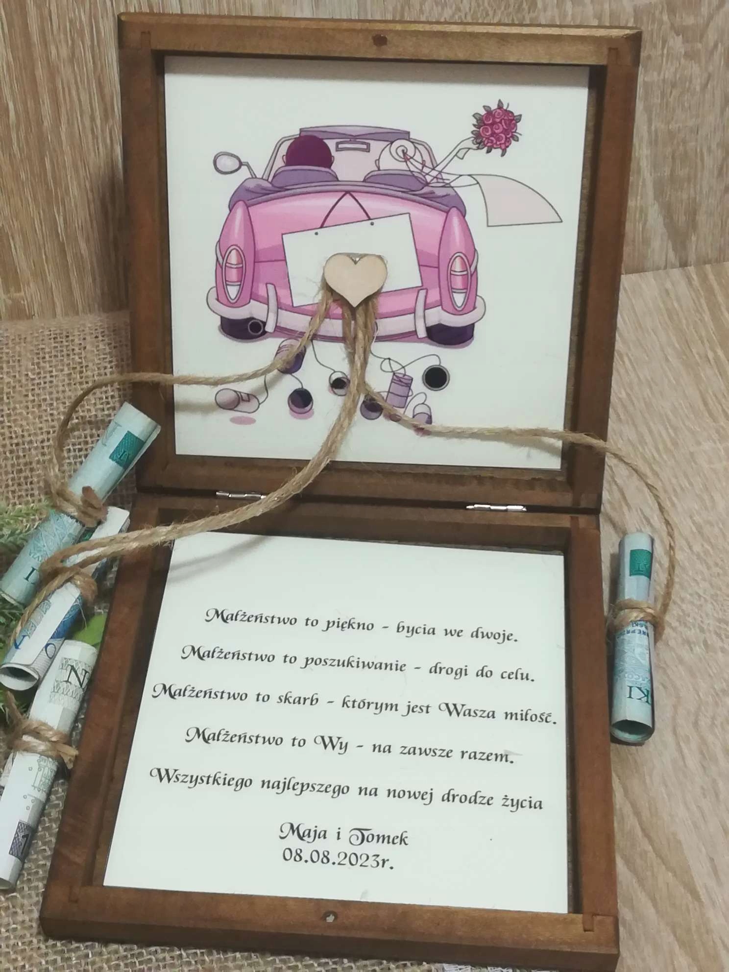 - Він виконує роль конверта, яка повільно стає не практичною і не дуже ефективною, але також після зняття банкнот буде прекрасним, постійним нагадуванням, в якому ви можете зберігати, в якому можна зберігати, в якому банкноти можуть зберігати в напр. компакт -диск із записом із весільної церемонії. 4