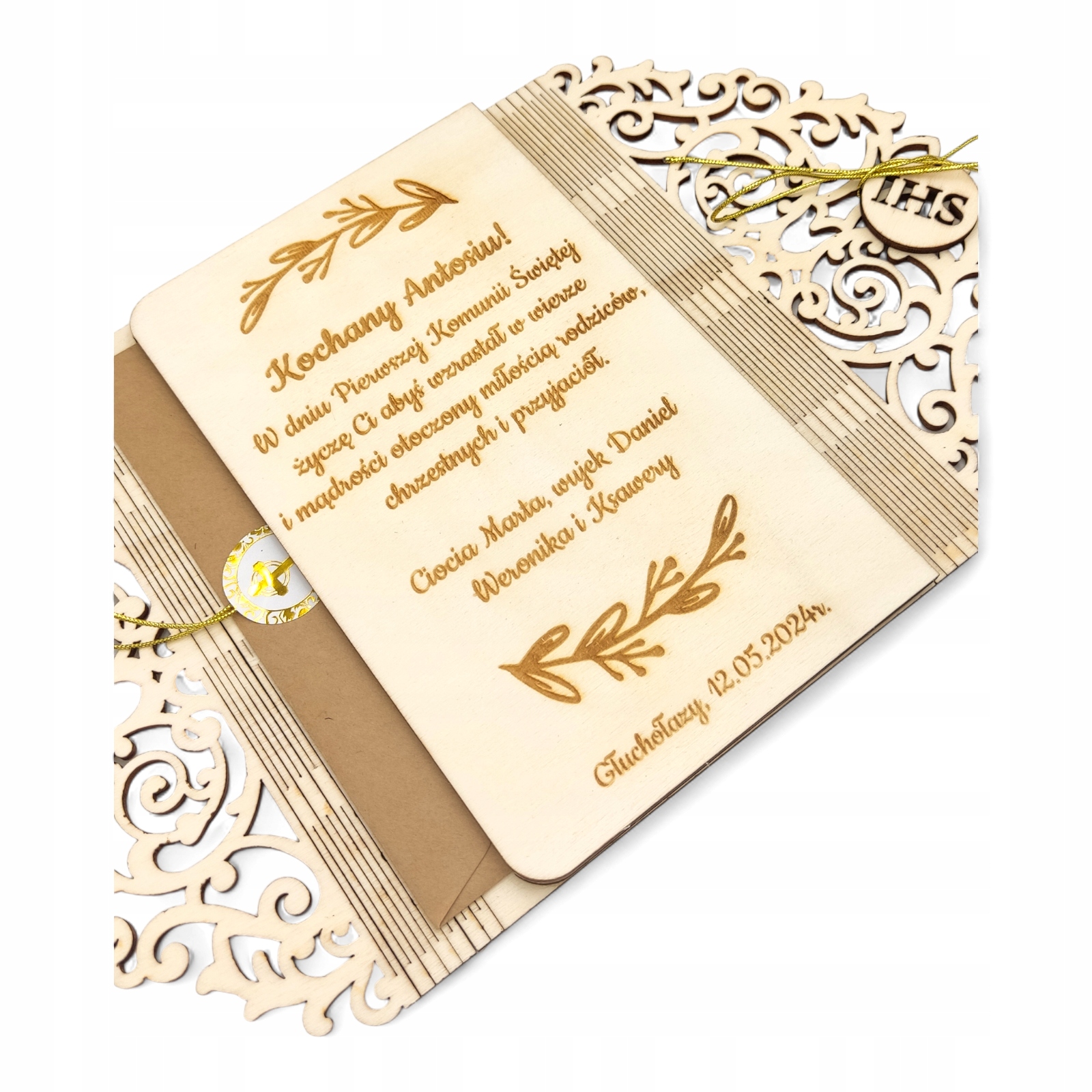 Сувенір до Першого Причастя - іменна дерев'яна, ажурна листівка з гравіюванням