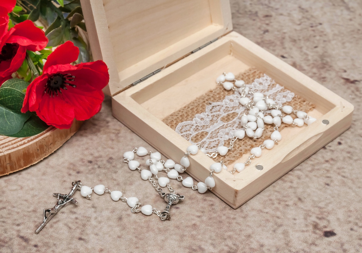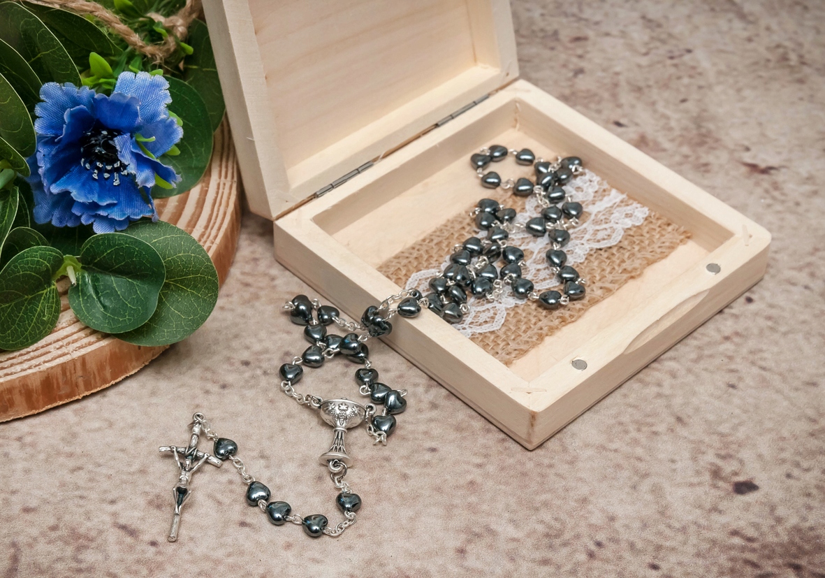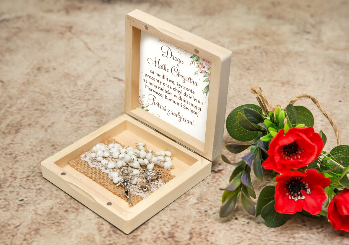 Дерев’яна коробка з прекрасним розарієм (серця) як сувенір Святого Причастя. за дитину або подяку хрещеним батькам або бабусям бабусям.