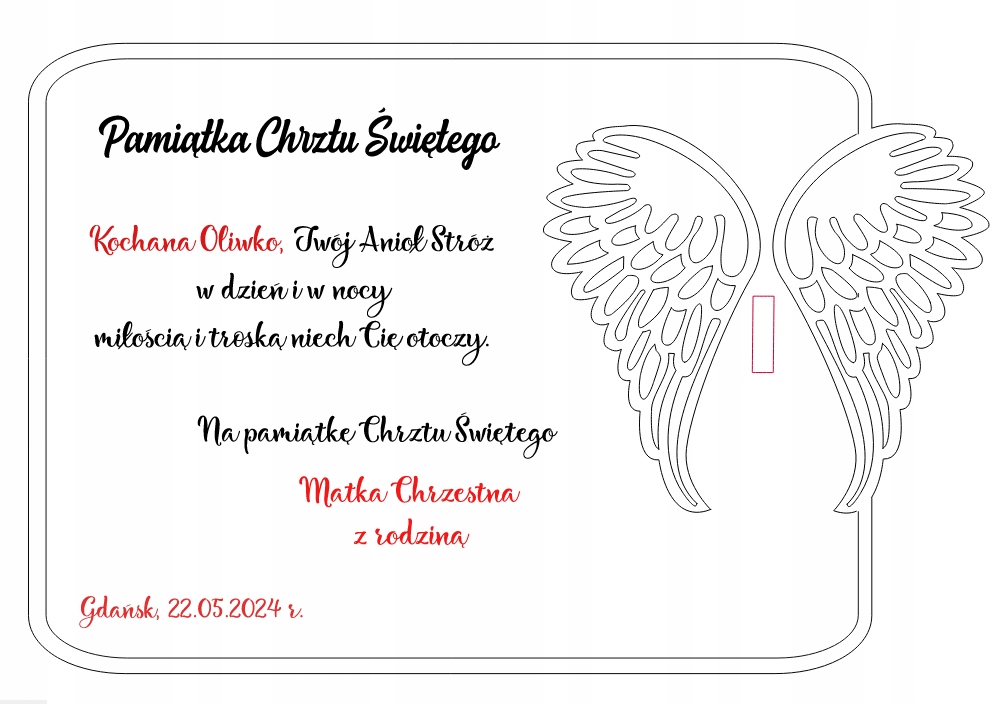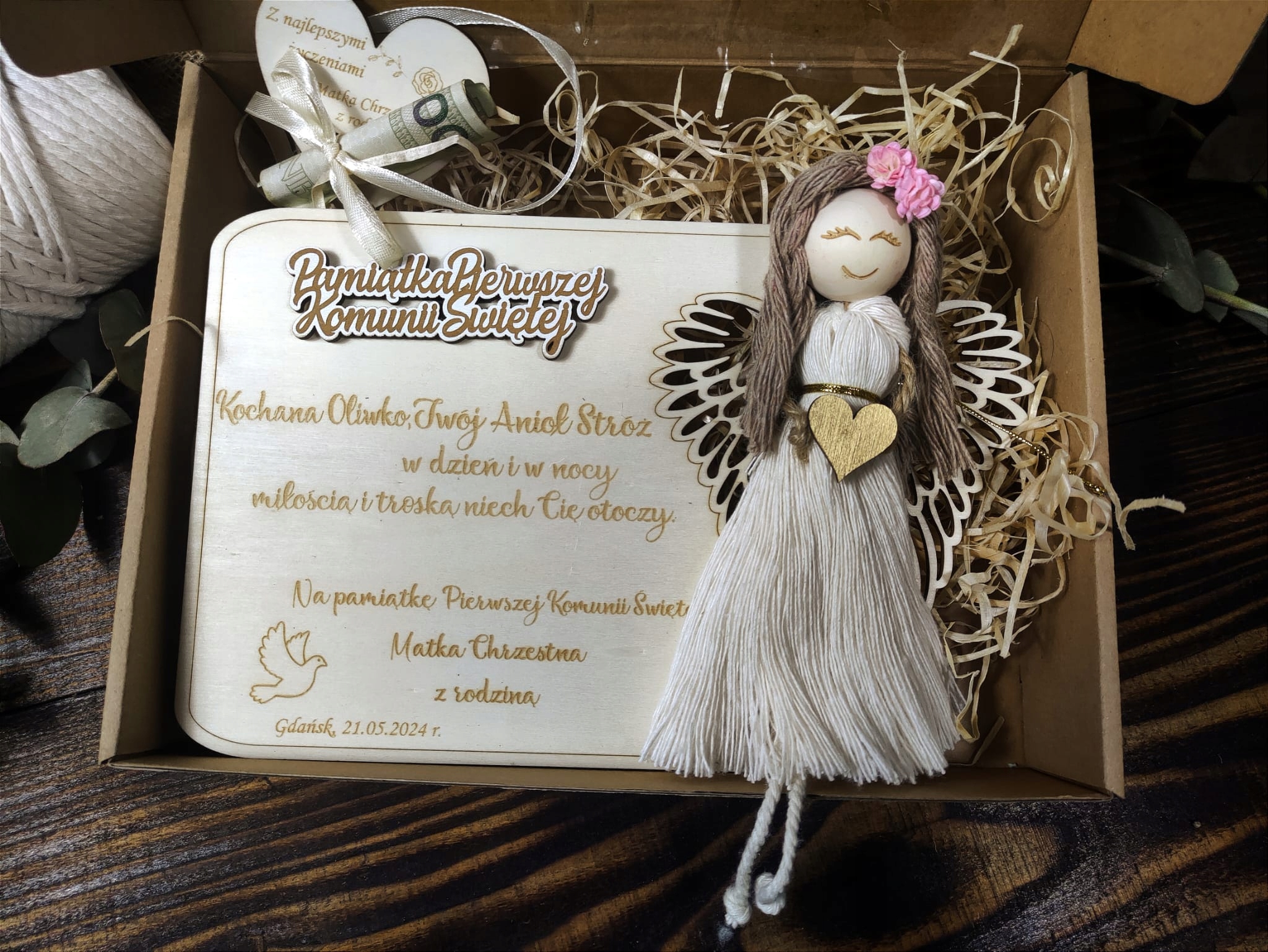 Унікальним сувеніром на святі стане дерев'яний сувенір Святого Хрещення/Першого Причастя з ангелом-охоронцем ручної роботи та повною персоналізацією, тобто гравіюванням імені дитини та підписом від кого побажання. їх важливого свята, яким є хрещення чи перше причастя