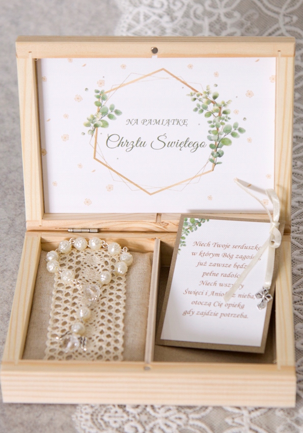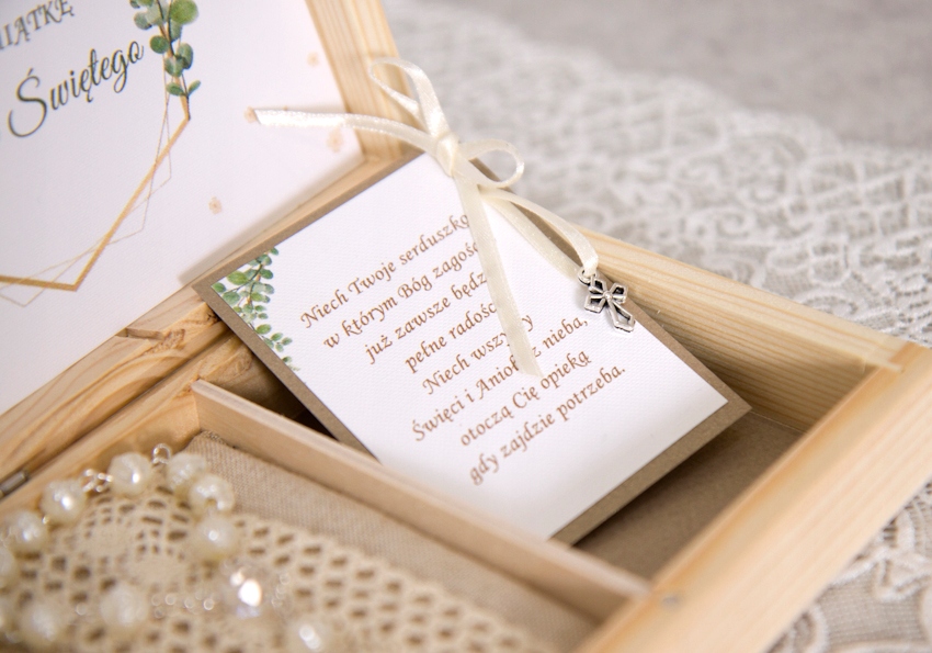 В коробці містяться побажання з невеликим декоративним хрестиком і невеликою вервицею.