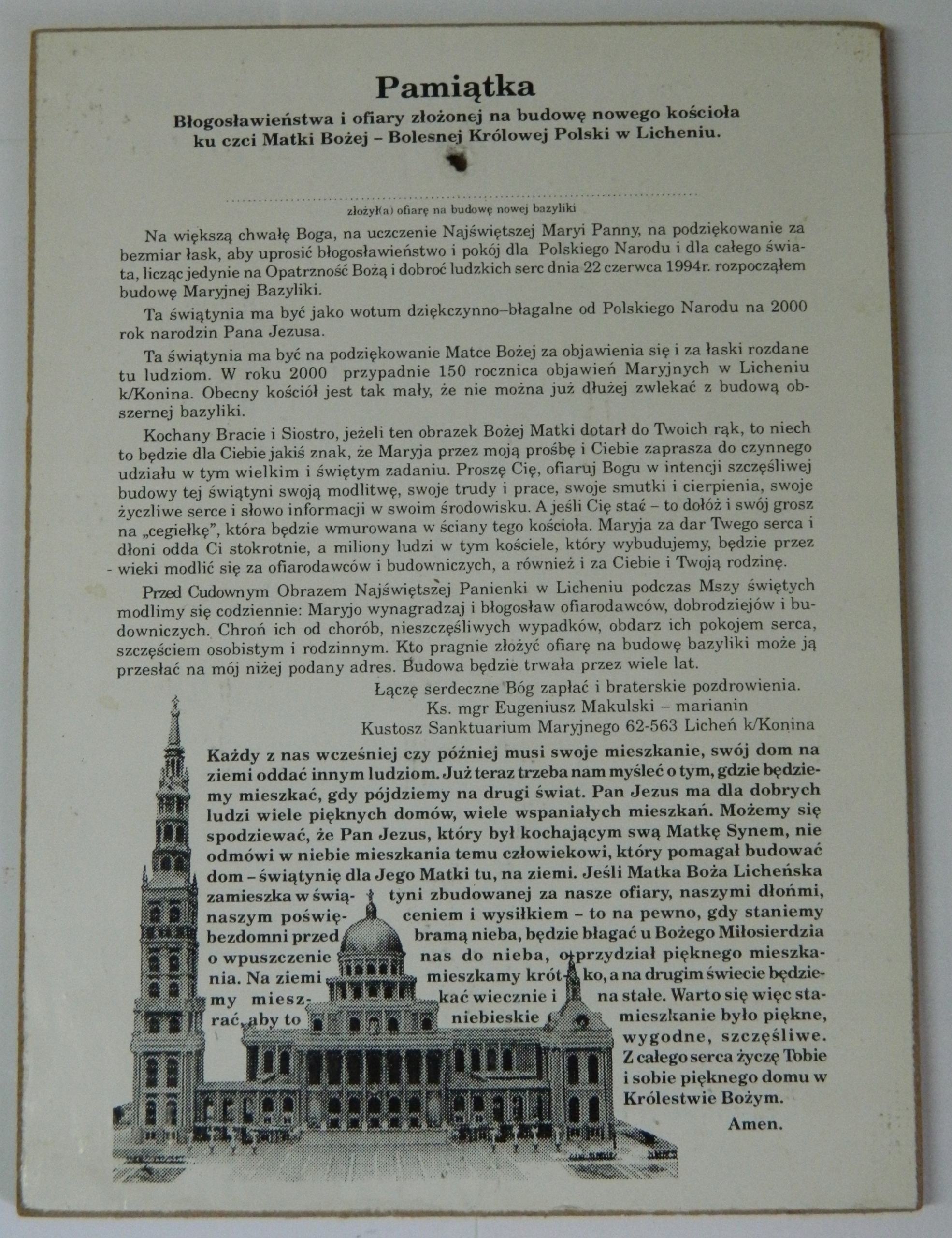 Сувенір LICHEŃ Матір Божа Королева Польщі Малюнок