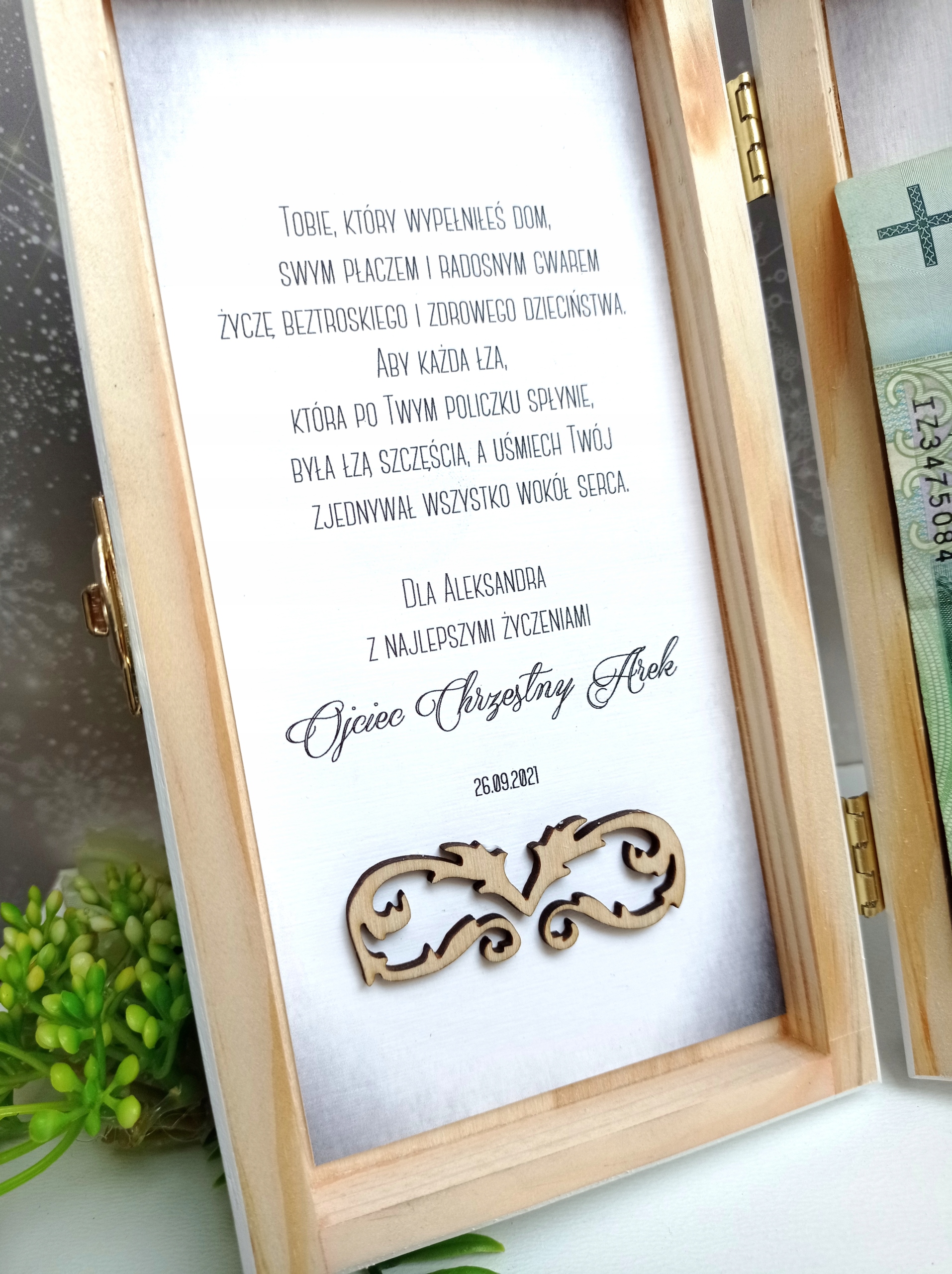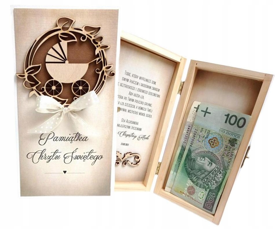 Дерев’яну коробку з персональними побажаннями та місцем для готівки чи іншого подарунка.