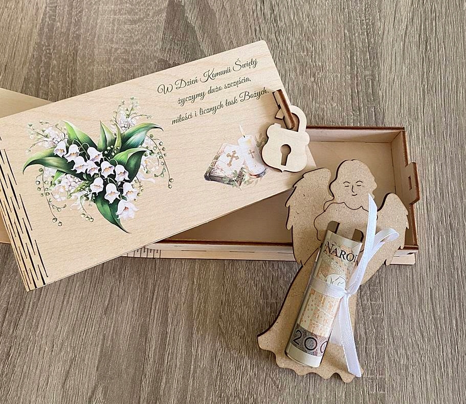 Дерев'яна скринька є ідеальним сувеніром про Перше Святе Причастя та елегантна форма подарунка