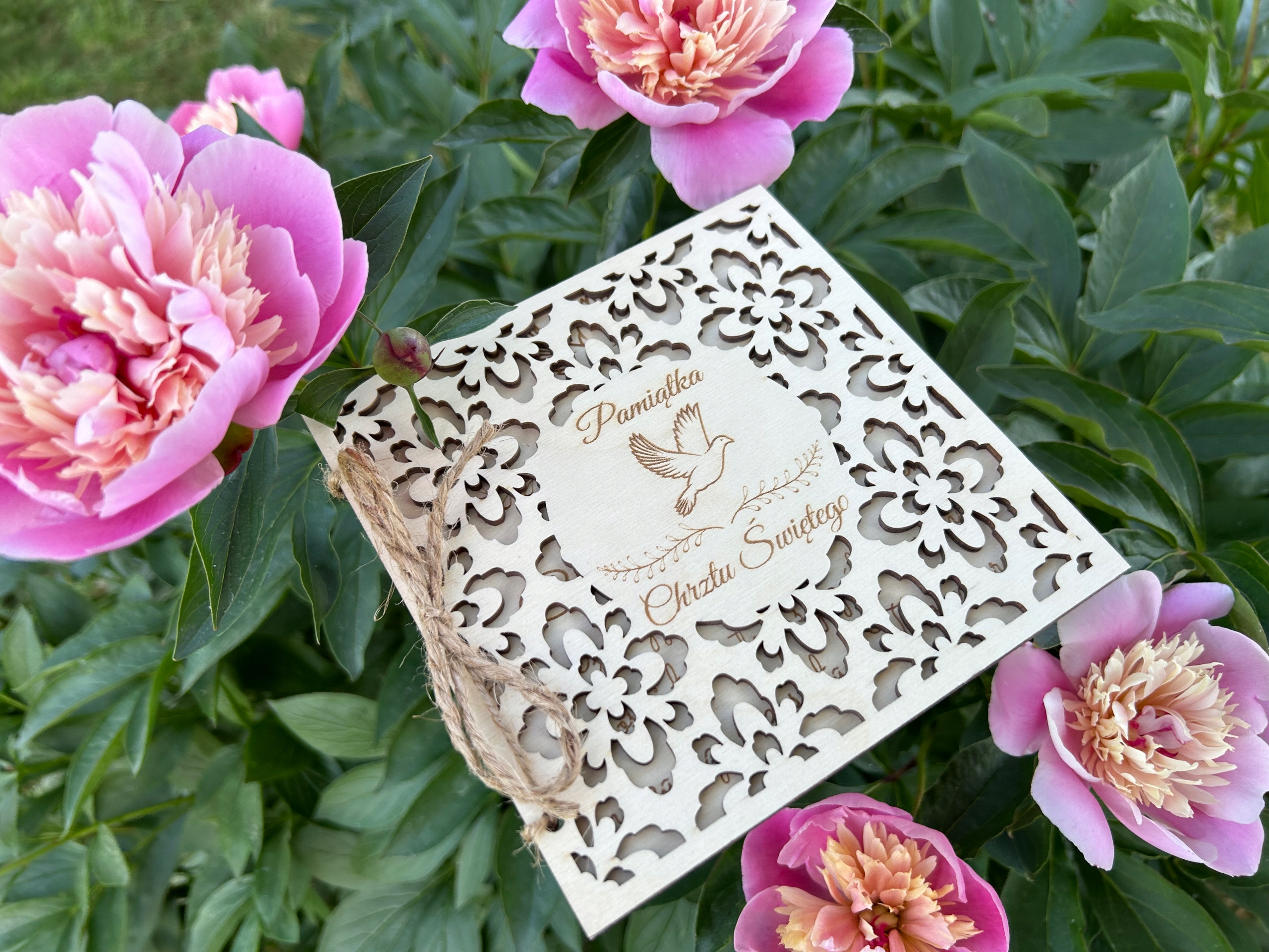 Елегантний ажурний сувенір Святе Хрещення у вигляді дерев'яної книги в комплекті з декоративним конвертом.