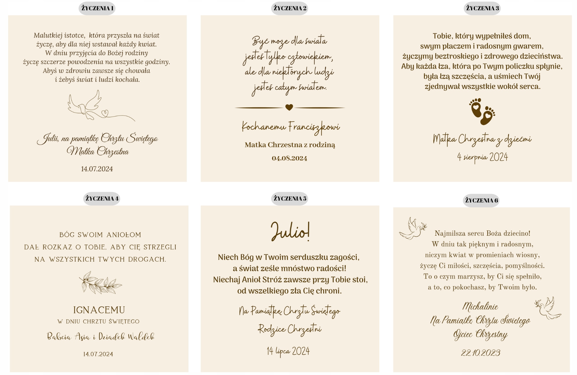 - Імена людей, які створюють побажання (наприклад, хрещена мама, дядько Дарек)