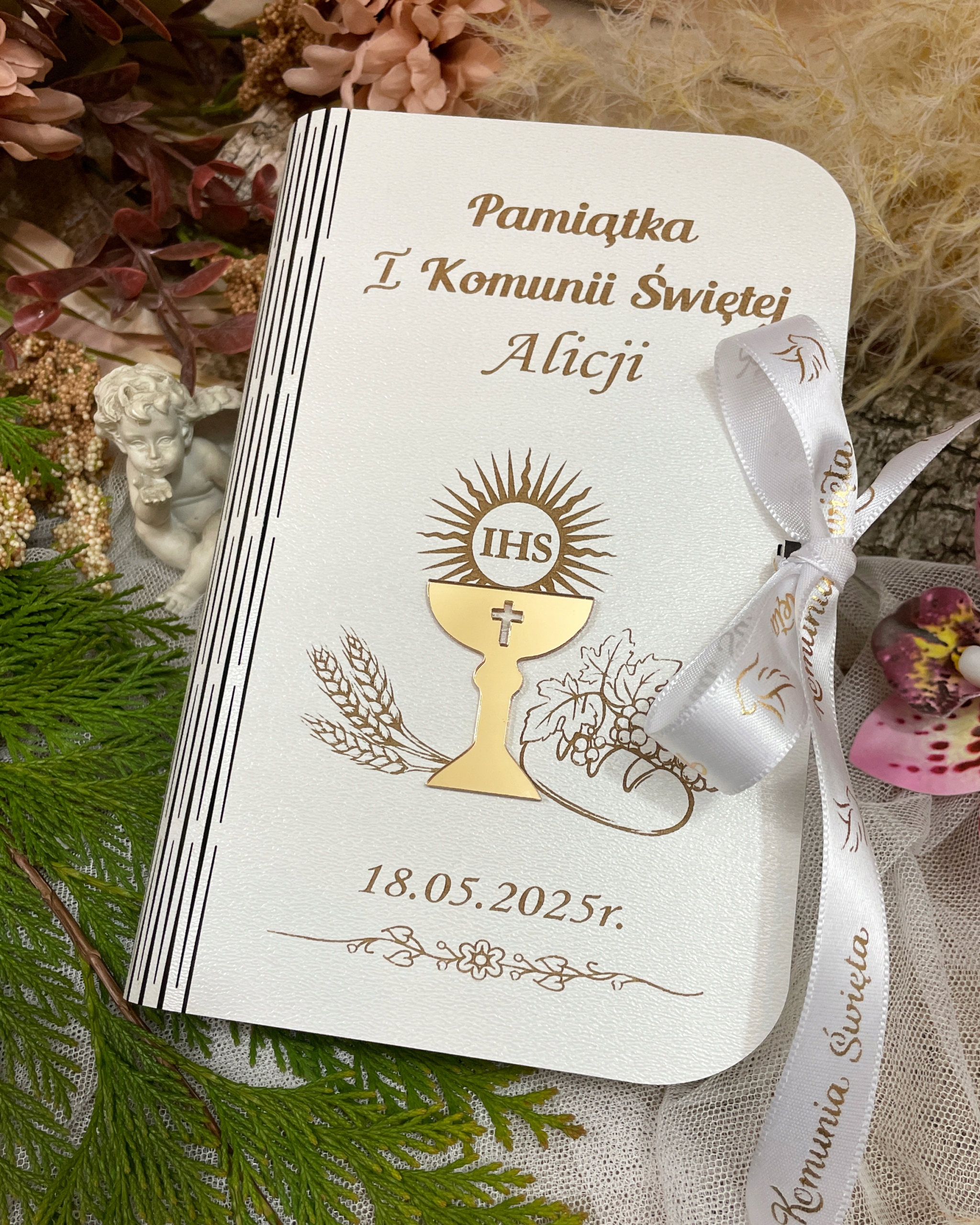 Персоналізоване причастя, сповнене символізму віри та чистої елегантності. З іменем дитини та побачення це стане прекрасним нагадуванням про зустріч з Ісусом вперше в Євхаристії