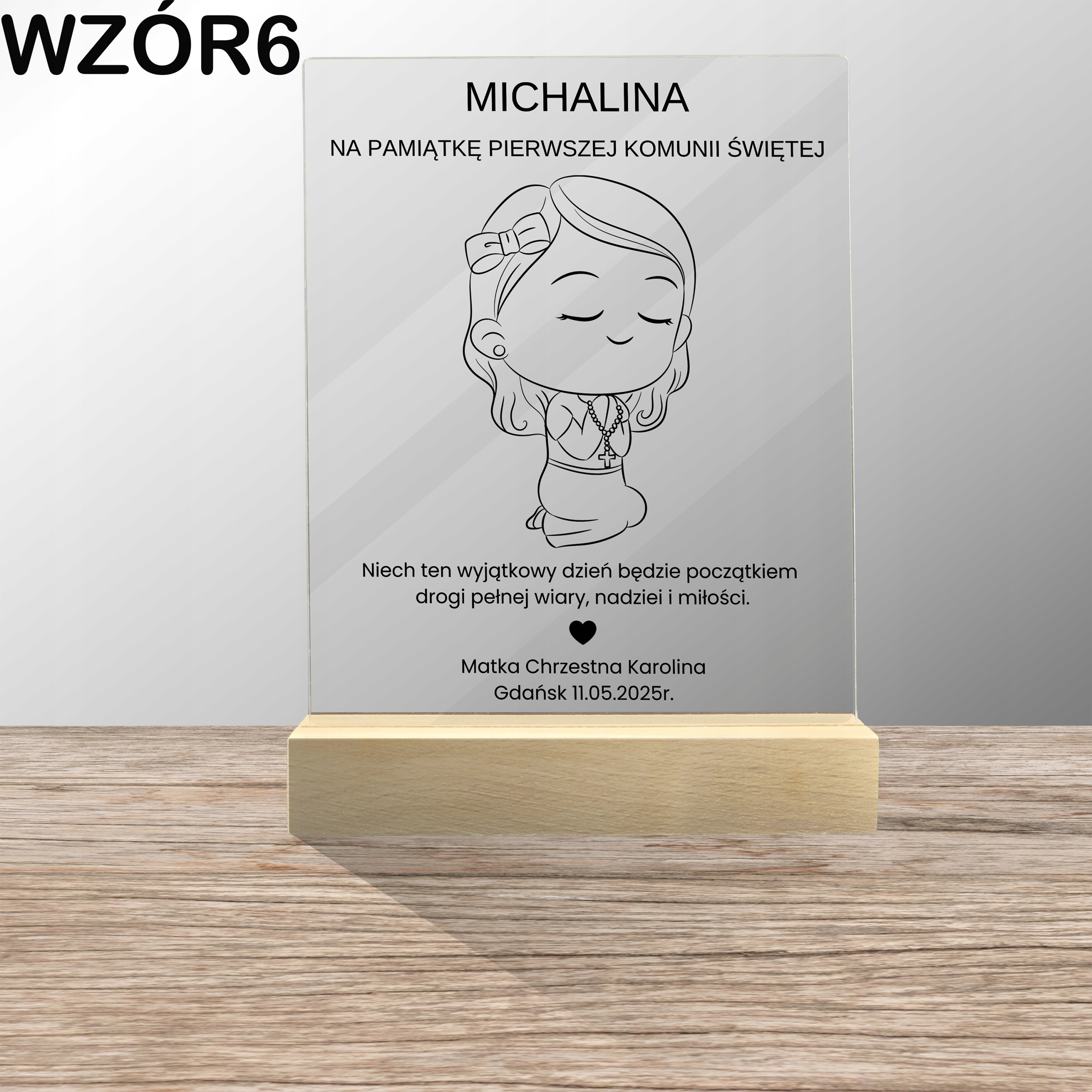 Ви шукаєте унікальний подарунок для першого Святого Причастя ? Ця картина на акриловому склі - це оригінальний, елегантний і міцний сувенір, який ідеально вписується в піднесений характер цієї церемонії. Розташований на дерев’яній основі, прикрашеній індивідуальним ультрафіолетовим принтом та упакованим в естетичну коробку стрічкою - вражає зовнішній вигляд та якість виготовлення. Це ідеальний подарунок , який буде залишатися з дитиною багато років як прекрасна пам’ять про важливий день.