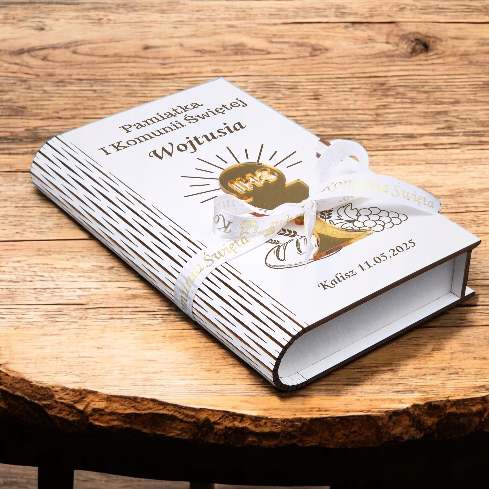 Елегантний, персоналізований Грошові коробки - це унікальний спосіб зберігати подарунки з нагоди першого Святого Причастя . Виготовлений з високоякісних матеріалів та прикрашений золотистим елементом, це ідеальний подарунок, який стане прекрасним сувенірам протягом багатьох років.