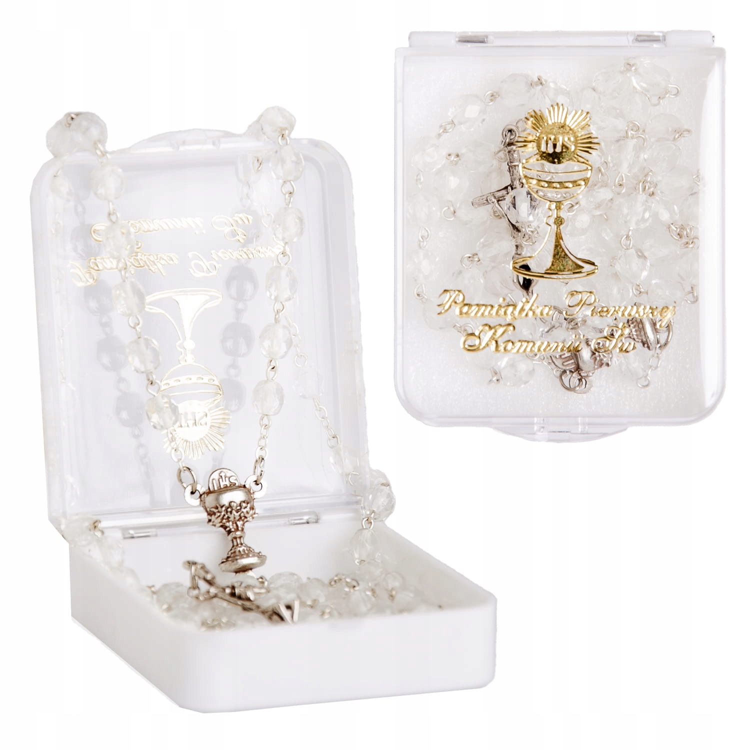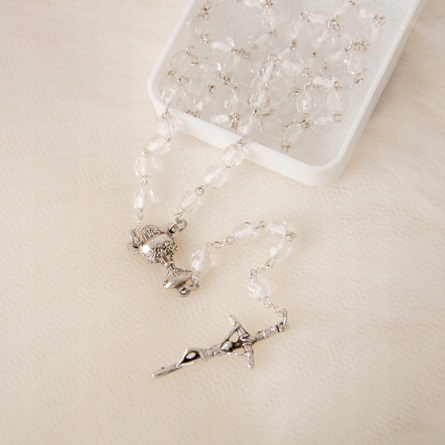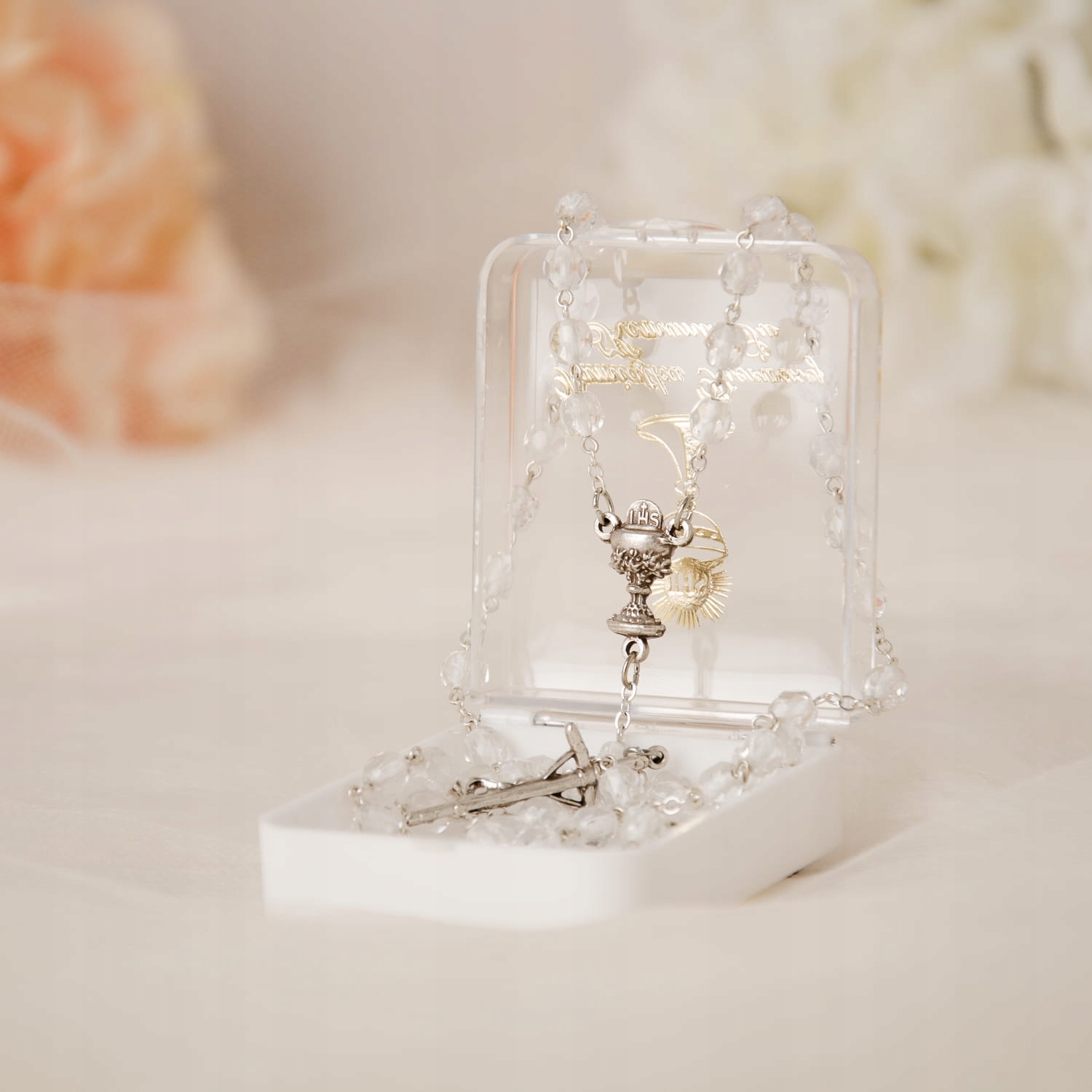 Красива вервиця для причастя з кришталевими елементами на посрібленому ланцюжку.Наприкінці виробу чаша з Гостією та Ісусом на хресті. Розарій є невід’ємним елементом таїнства Першого Святого Причастя, а після церемонії буде чудовим сувеніром на довгі роки.