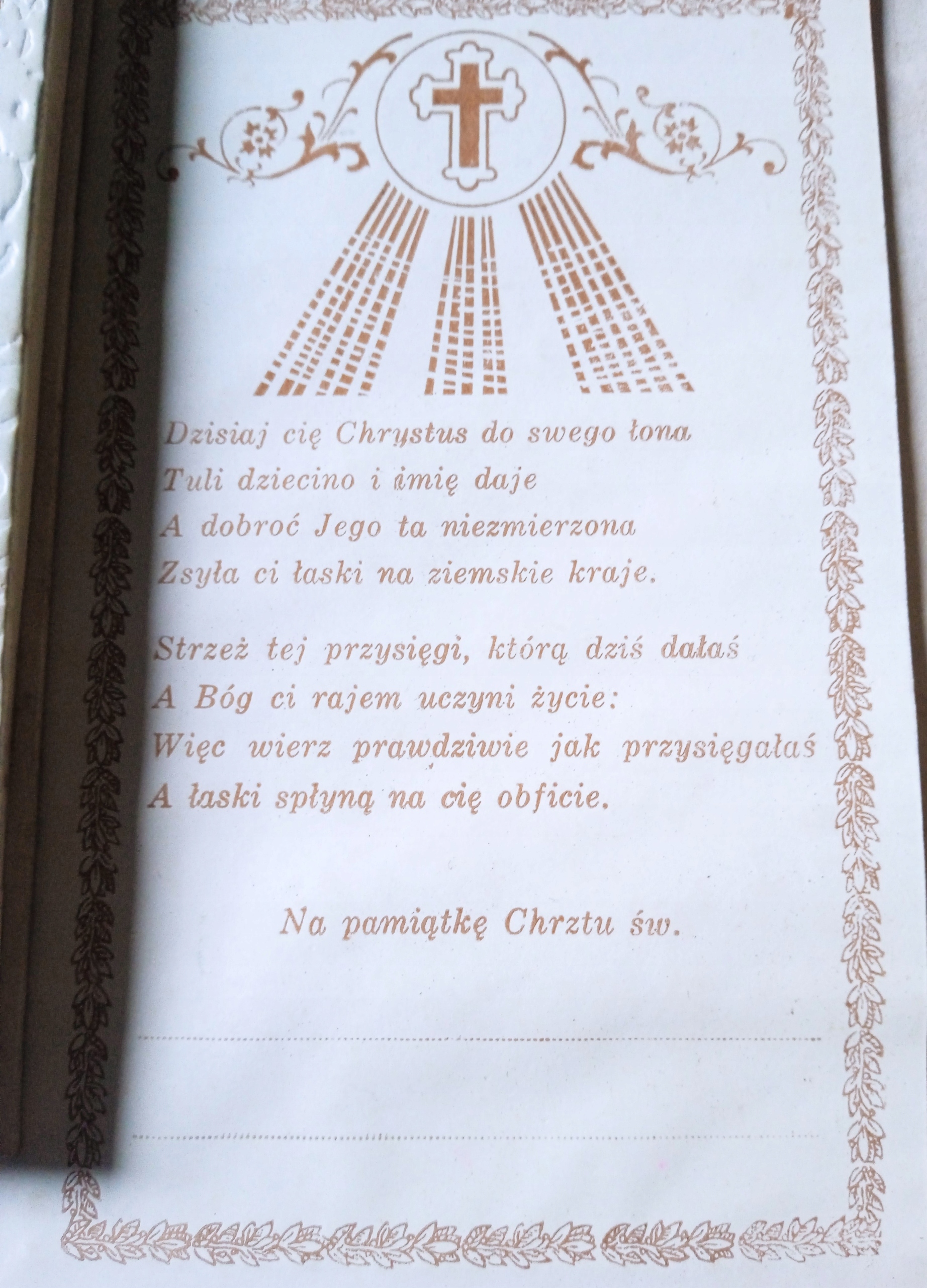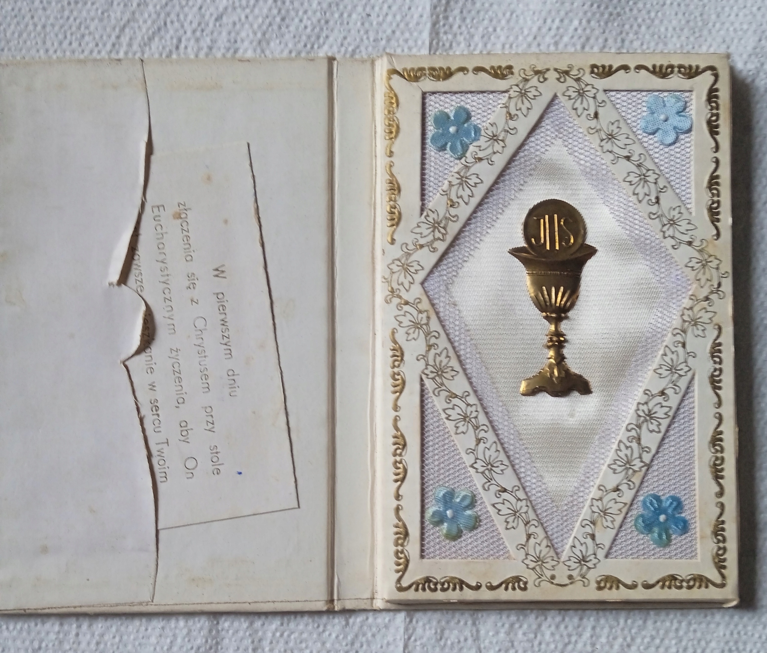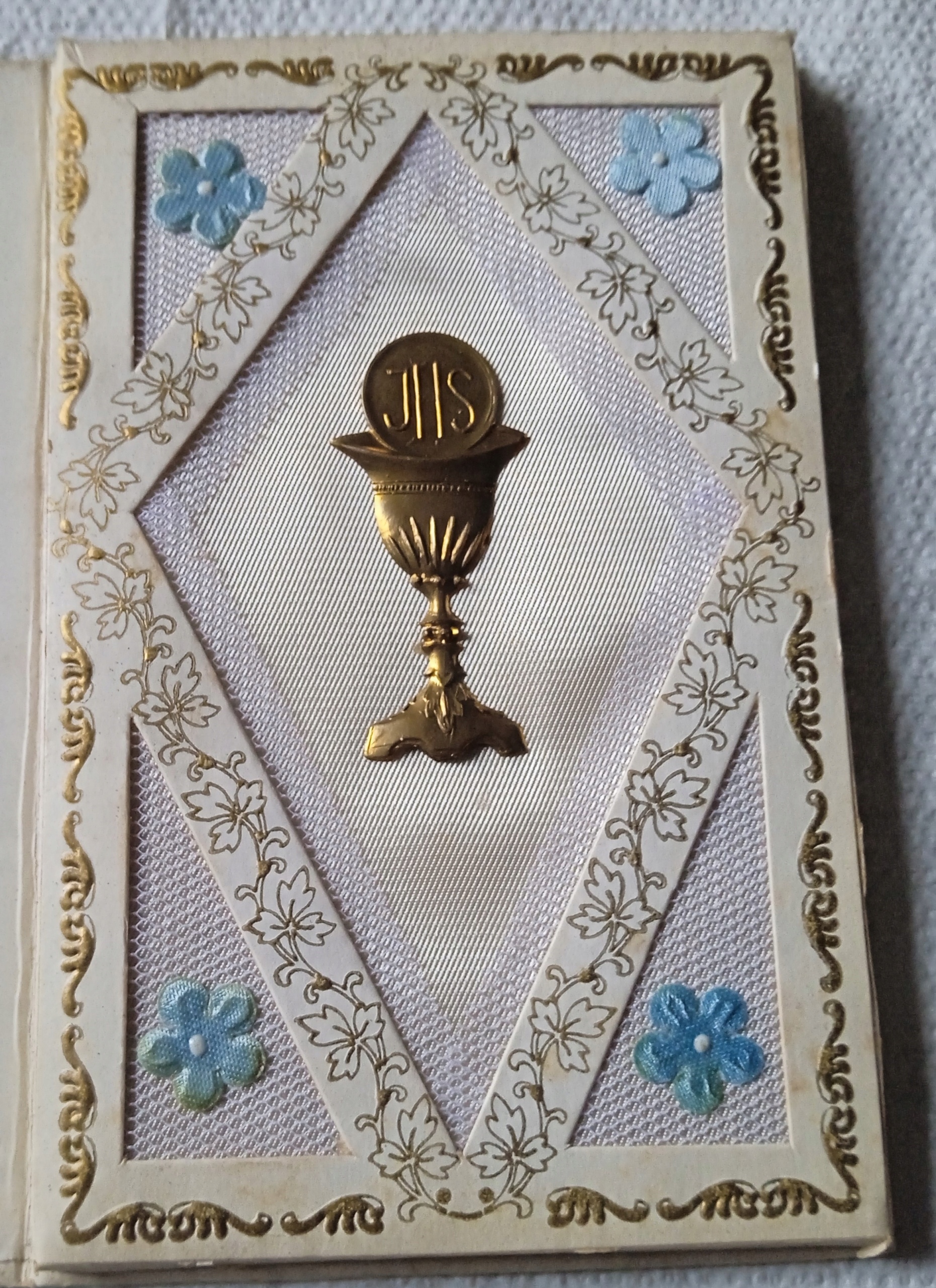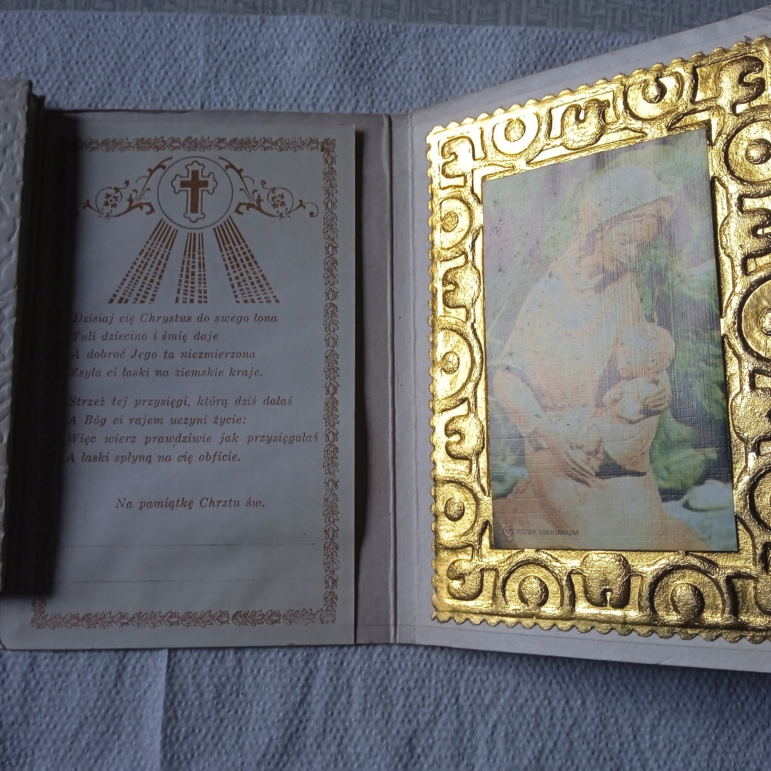 Я пропоную два сувеніри на продаж - одне хрещення, інше перше причастя, зроблене у другій половині 1960 -х. Сувеніри в обкладинках з нерегулярними картонними візерунками в білих позолочених прикрасах. Хороший стан, хоча незначні знебарвлення, що виникають внаслідок вологи внаслідок проведення декількох десятків років у ящику на столі. Розміри хрещення сувенір 15,7 х 11 см. Розміри сувенру та причастя 14,5 х 9,5 див. Прикраса у вигляді чашки в сувенірах та причастя, виготовленому з латуні. Ціна на весь набір - 2 штуки
