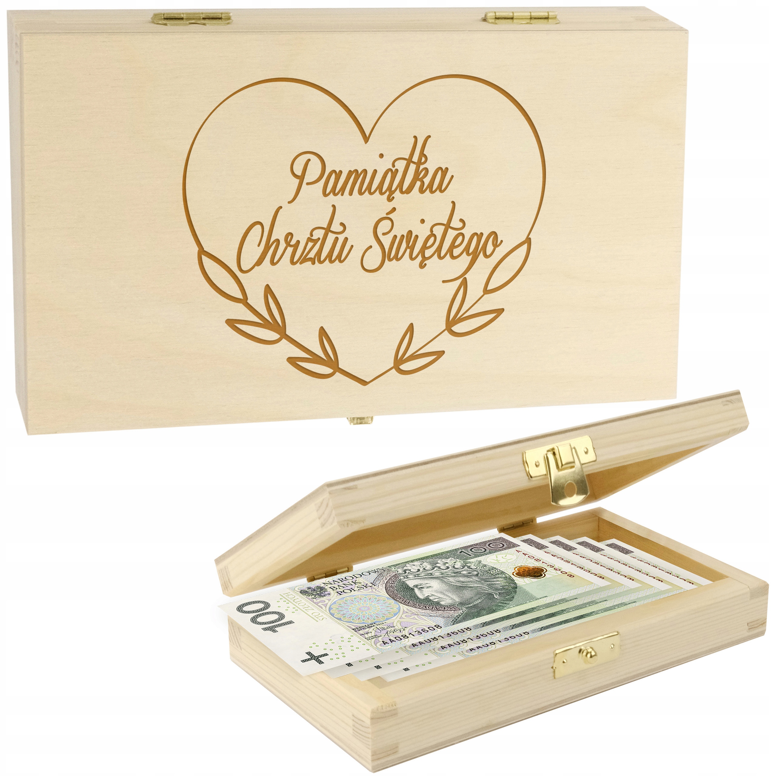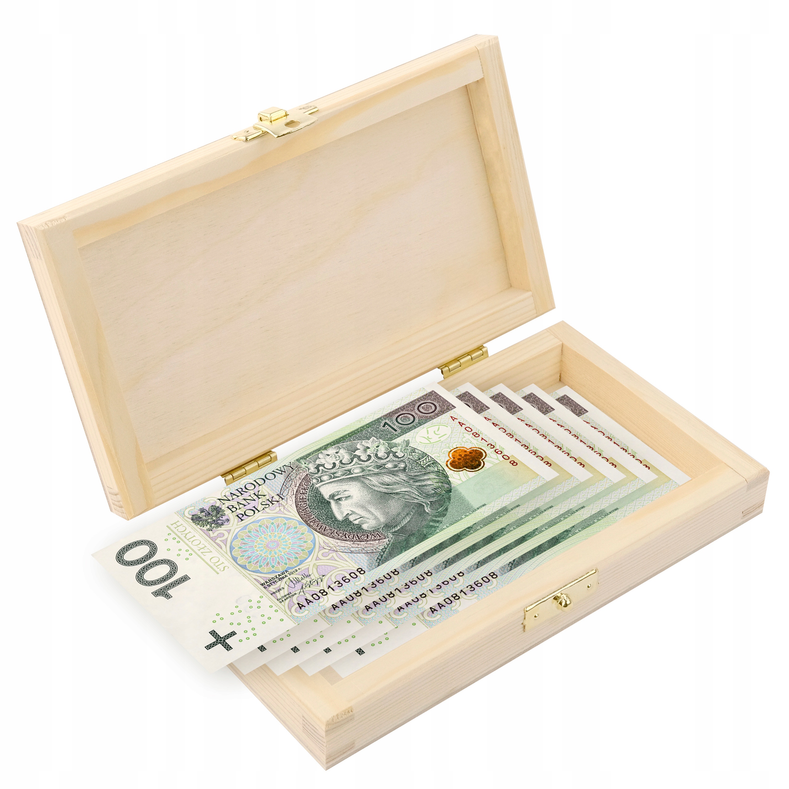 Розмір ящика ідеально відповідає розміру банкнот. Висота 3,5 см дозволить розмістити велику суму готівки, а його довжина і ширина легко вмістять банкноту номіналом 500 злотих.