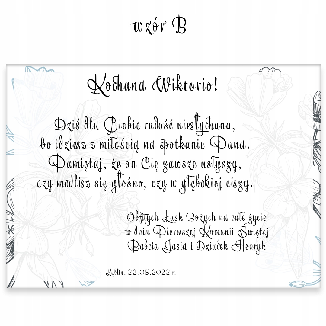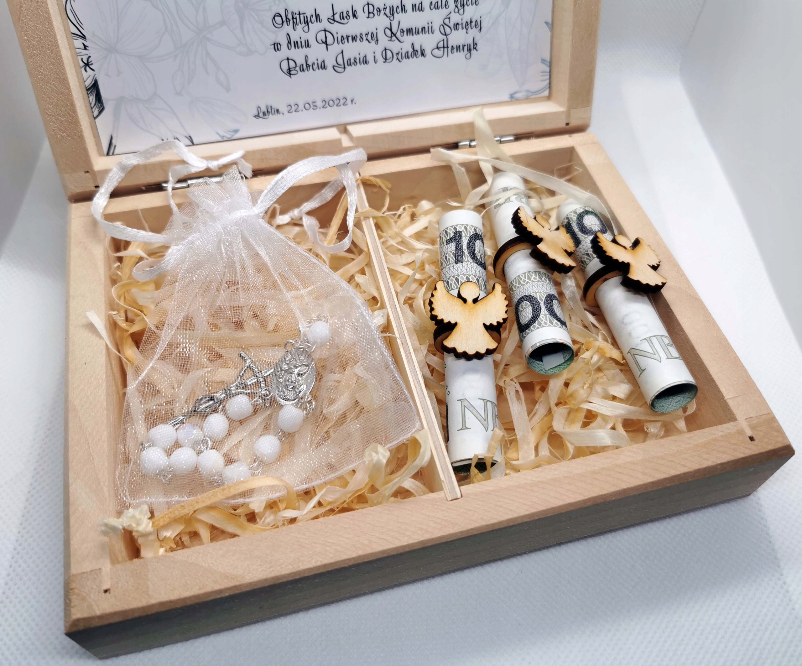 Сувенір на Перше Причастя у вигляді коробочки з білою десяткою чотки і три «янголи» за гроші. У верхній частині коробки є наклейка з побажаннями та персоналізацією. Нижня частина ящика наповнена деревною ватою. Лицьова частина надрукована за технологією УФ-друку. Кожна персоналізація готується індивідуально під клієнта. Скриньку чудово можна використовувати як скарбничку для Першого Святого Причастя. Ми додаємо три штуки "янголів з каблучкою" в кожну коробку, щоб розмістити гроші. Купюри в ящик не входять. Ви можете додати власний текст побажання.