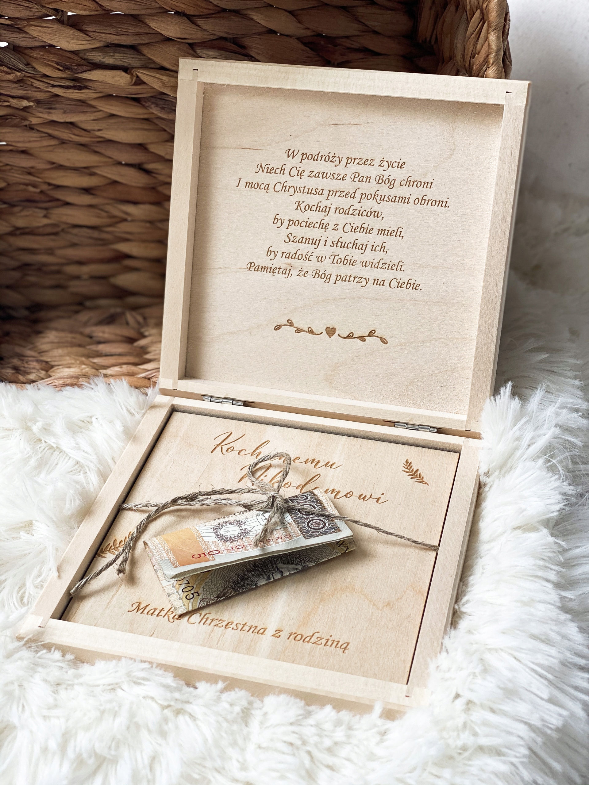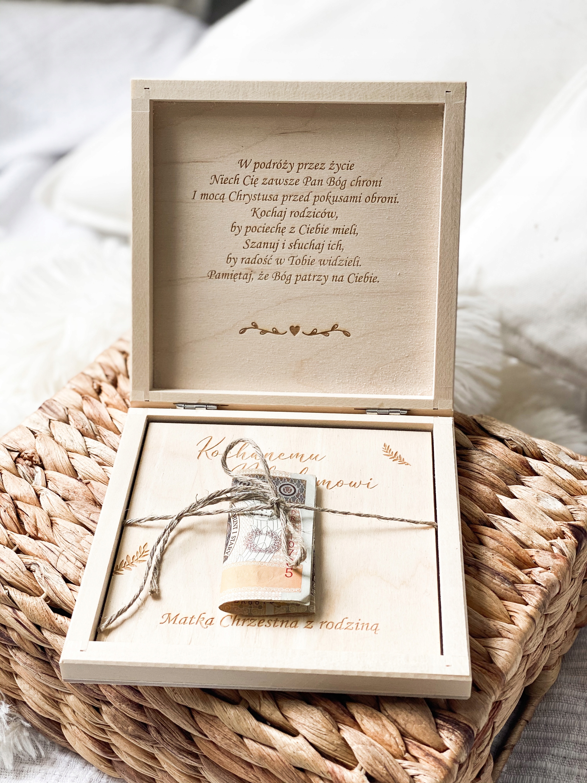 Індивідуальна скринька для Першого Святого Причастя, в яку можна сховати гроші, перев'язані джутовою ниткою. Це буде унікальний подарунок, який замінить паперову листівку та сувенір на довгі роки!
