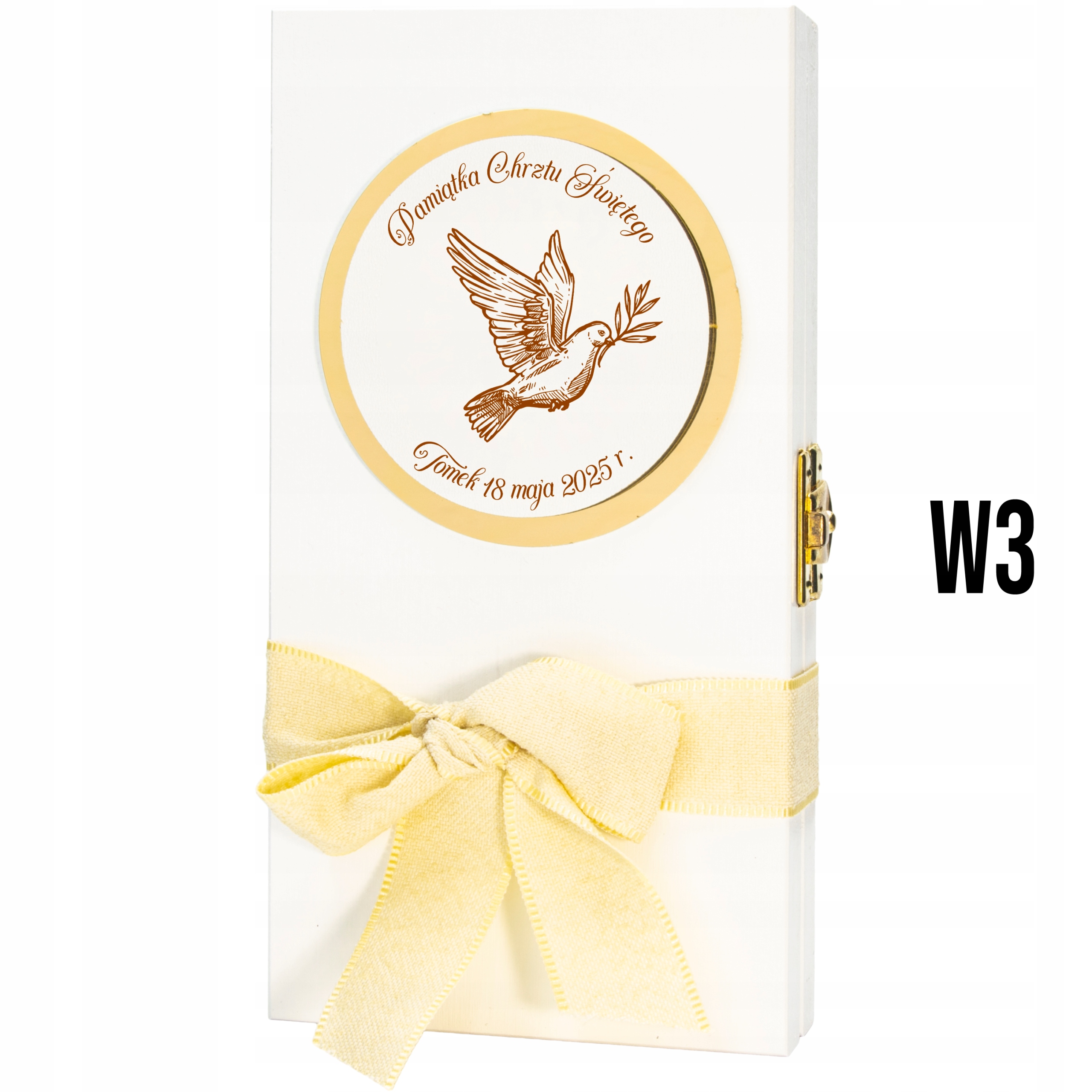 ✅ Ексклюзивна виготовлення - скринька, виготовлена з високоякісної натуральної сосни, пофарбованої білою, з елегантною гравюром та золотим, дзеркальним нанесенням у формі голуба - символу Святого Духа.