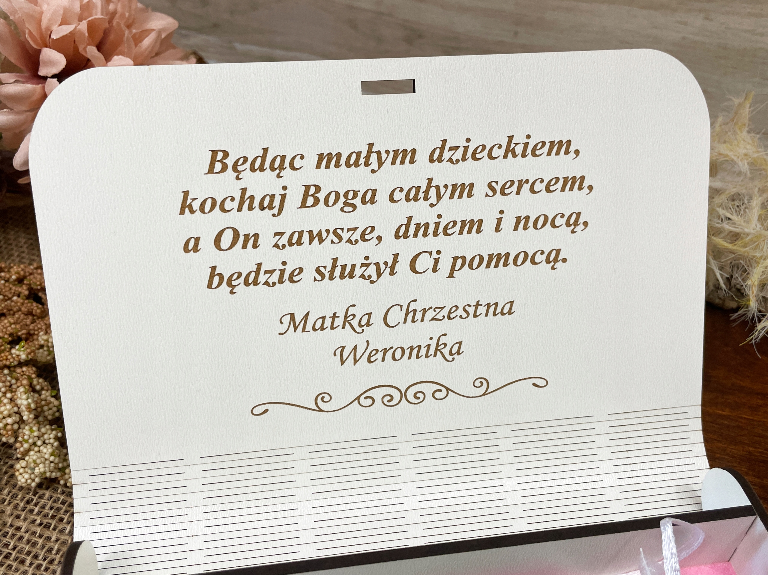 Персоналізована скринька, сповнена символіки віри та чистої елегантності. З іменем дитини та побачення це стане прекрасним нагадуванням про зустріч з Ісусом.
