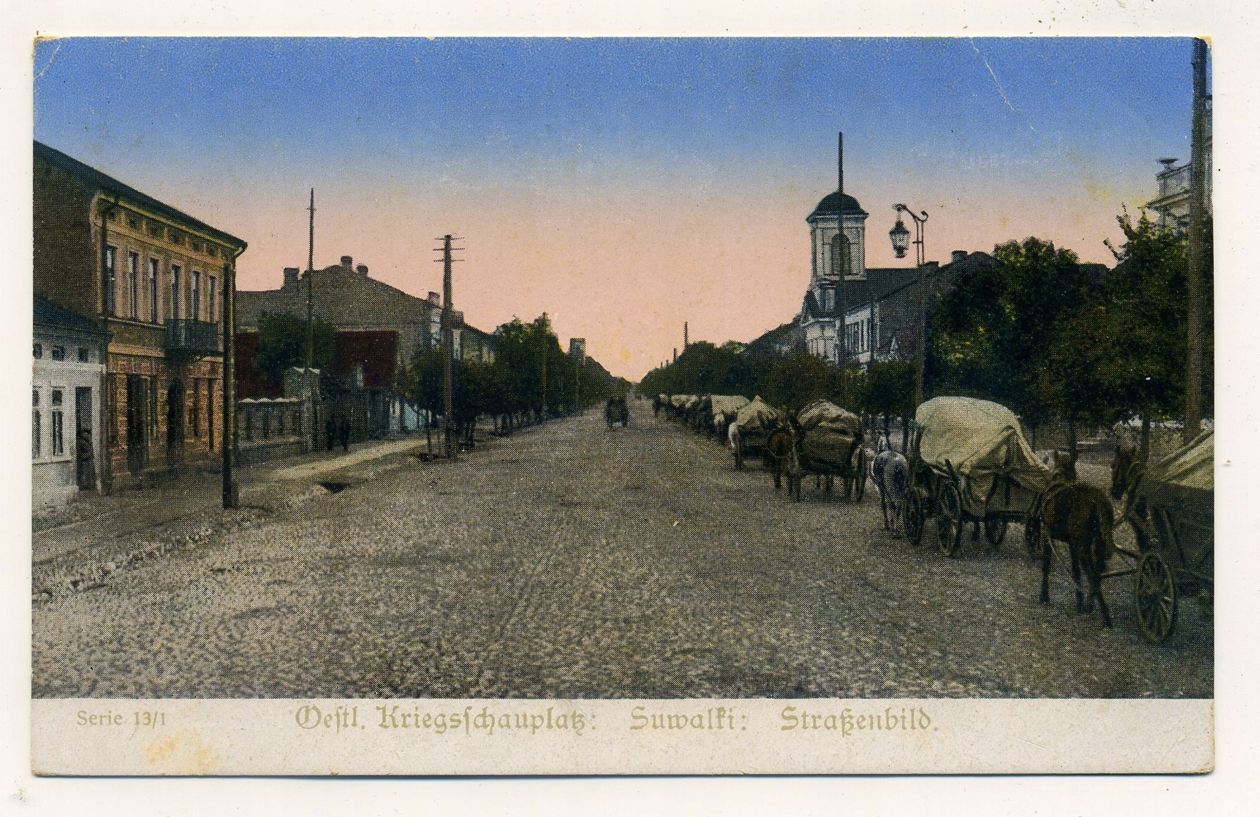 сьогодні на аукціоні листівка з Сувалків - рухомий склад на вул. Костюшко, євангельська церква на задньому плані, Перша світова війна, вид. Глорія-Вікторія, серія 13/1, анциркулейтд, у дуже хорошому стані - (верхній лівий кут зламаний, невелика зморшка з правого боку).