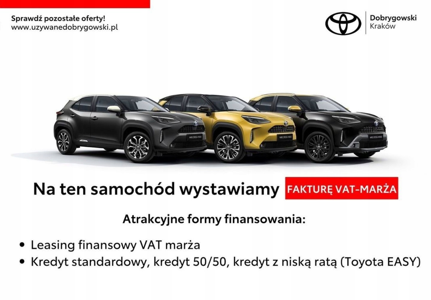 Toyota Dobrygowski - уповноважений дилер Toyota та Lexus, компанія, що працює на автомобільному ринку понад 25 років, насолоджуючись великим визнанням клієнтів, які відвідують наші салони (багато разів присуджуються як дилер року), розташованих у кількох великих польських містах.