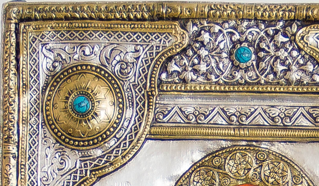 Виготовлено з посрібленого та позолоченого 24-каратного золота, міді. Усе хімічно зістарене та поліроване до бажаного ефекту. Металева поверхня остаточно покрита прозорим лаком, який є чудовим захистом від зміни кольору срібла та пилу тощо. Весь вбрання Мадонни розписано вручну. Ручний розпис. Лазерна олія на акриловій основі. Шар глазурі надає картині глибини та відчуття «старості».
