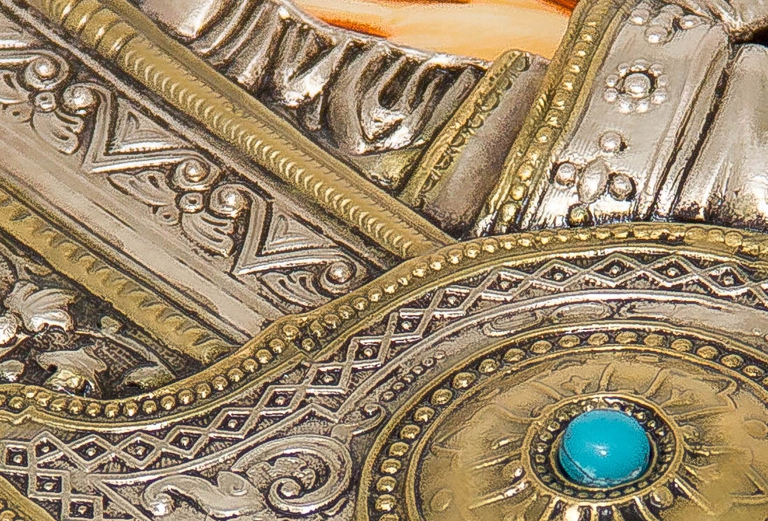 Матеріал: мідь, срібло, золото, дерево, бавовняний оксамит