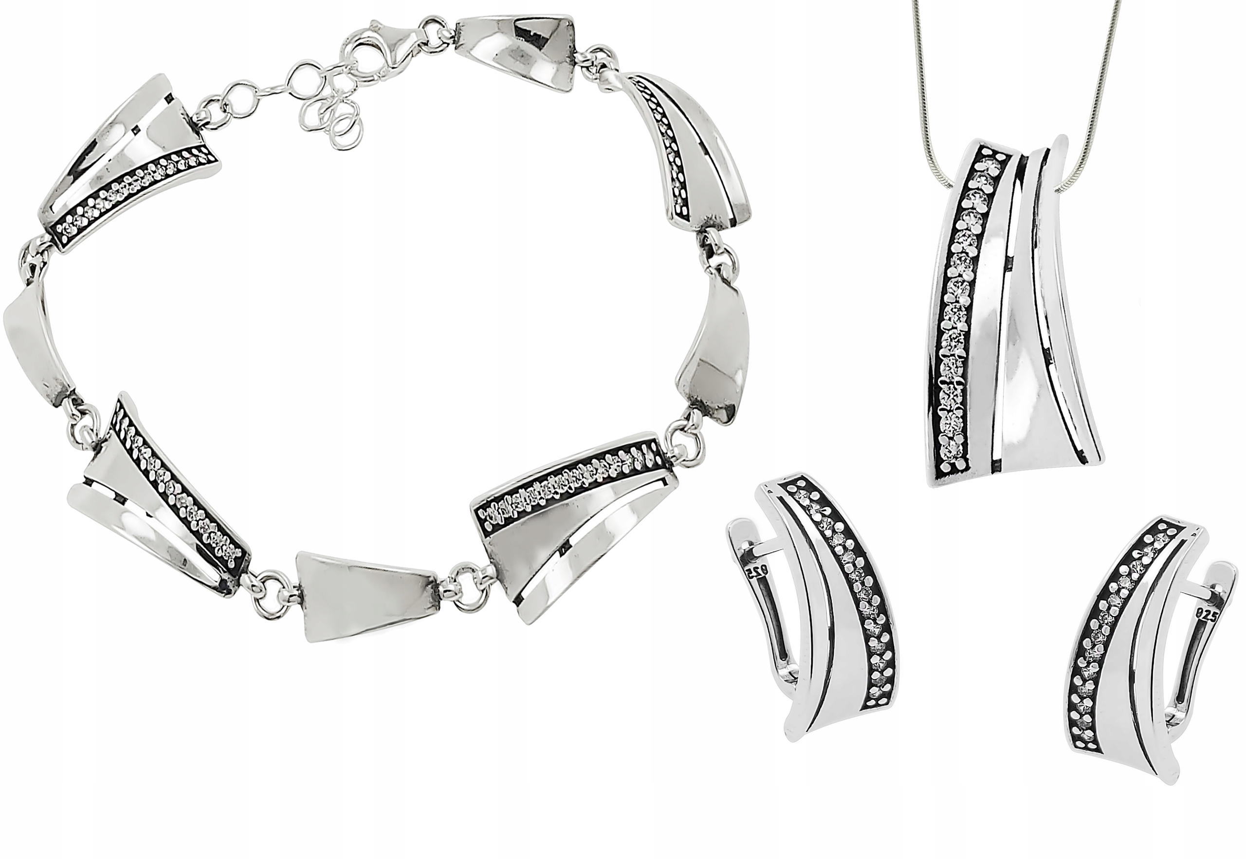 Срібні жіночі прикраси з чуттєвою формою та елегантною обробкою ідеально підходять для будь-якого випадку. Це ідеальне доповнення до бальних і офісних образів. Додавання кубічного цирконію додає елегантності та вишуканості. Набір складається із сережок, кольє та браслета та виготовлений зі срібла 925. Стильна упаковка з індивідуальним гравіюванням робить набір чудовою ідеєю для подарунка.