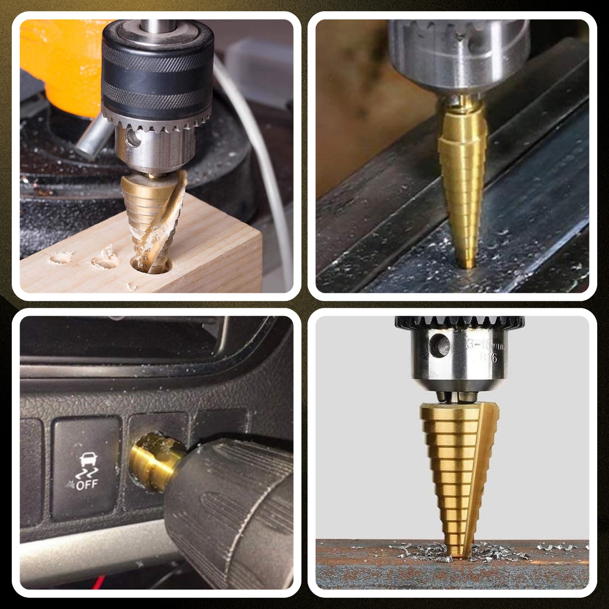 ✅ Конічні ступінчасті свердла: цей набір включає три ступінчасті свердла. які дозволяють точно свердлити та вирізати отвори різного діаметру. Їхня ступінчаста конструкція дозволяє точно налаштовувати необхідні розміри отворів без необхідності змінювати інструменти.