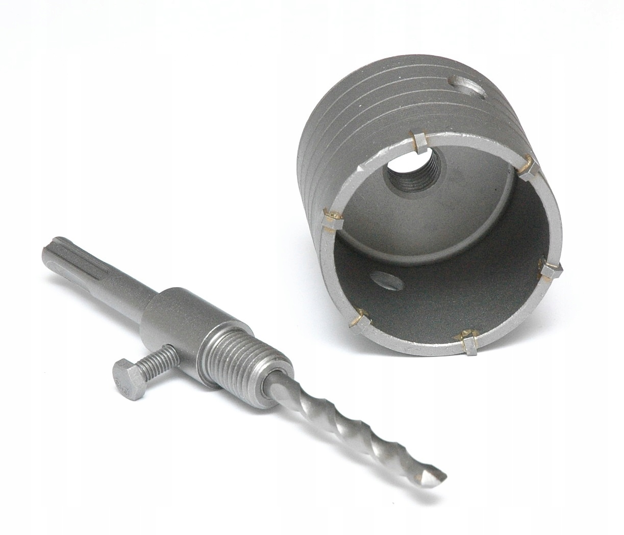 Коронкове свердло, оснащене 8 ріжучими пластинами з високоякісного спеченого твердого сплаву, припаяними до сталевого корпусу латунню.