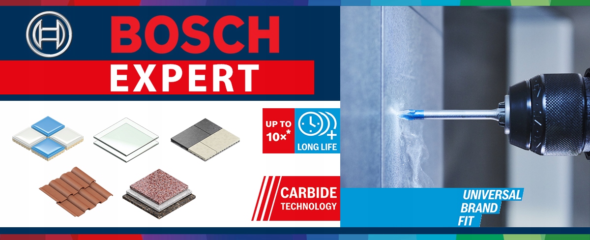 ДЛЯ ДРИЛІВ ТА ВИКРУТОК, ДЛЯ ДРИЛІВ ТА УДАРНИХ ВИКРУТОК Служить у 10 разів довше, ніж свердла для кераміки Bosch CYL-9