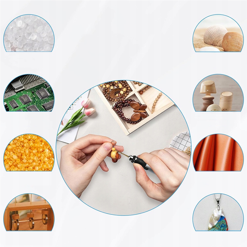 - Ця мініатюрна дриль була розроблена для ентузіастів DIY і ідеально підходить для персоналізації виробів з дерева, скляних прикрас, ювелірних виробів і не тільки. візерунки.