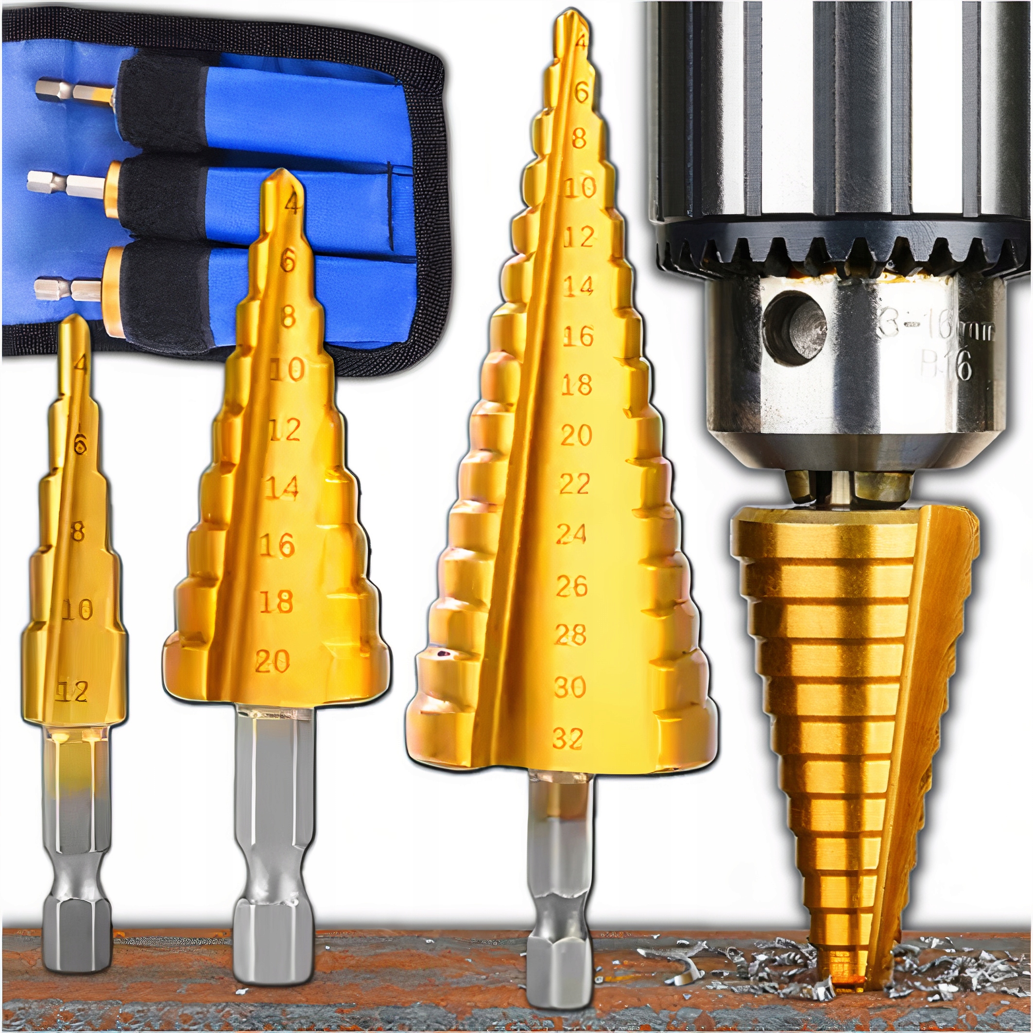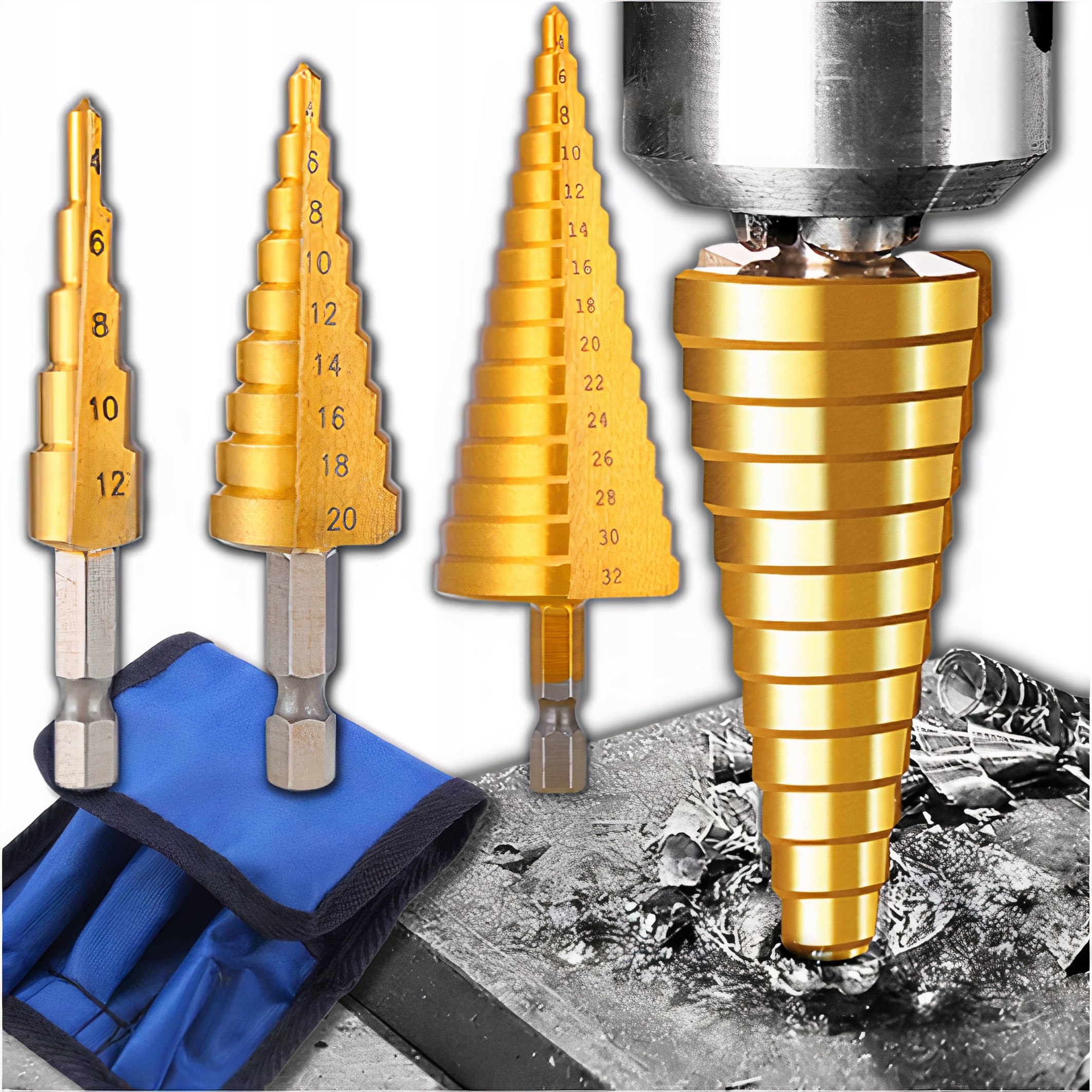 Наш набір із 3 конічних свердл із HSS (швидкорізальної сталі) з титановим покриттям забезпечує високу якість якість і довговічність. Ось чому варто обрати наш набір: