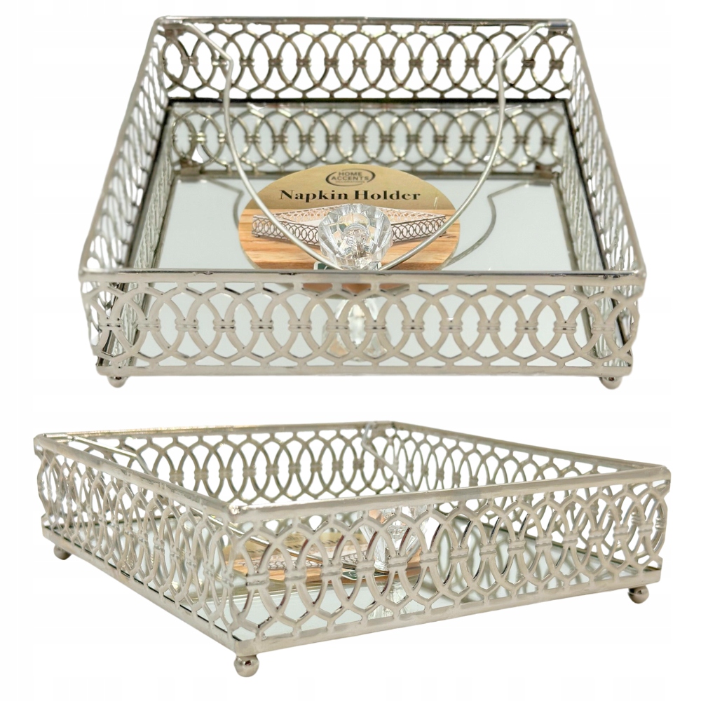 Елегантний контейнер для декоративних серветок. Оптимальні розміри дозволять зберігати велику кількість серветок, тому вам не доведеться турбуватися про часте наповнення контейнера. Серветниця має дзеркальне дно і кришталеву кулю, яка притискає серветки, що допомагає витягнути цільний шматочок і захищає від вітру на відкритому просторі.