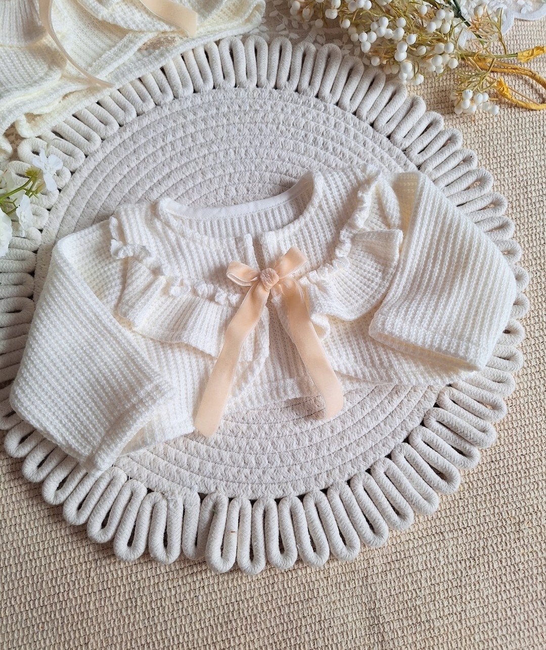 Светр кольору екрю для дівчинки, зав'язаний бежевим оксамитовим бантом.