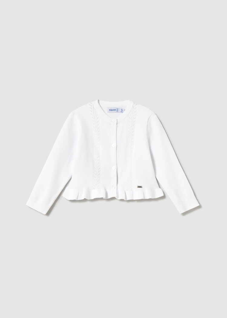 светр з довгими рукавами для дівчини, з мера іспанської компанії. Кругле декольте. Модель з класичним вирізом. Кріпляться кнопками спереду. В'язаний, ніжний і приємний на дотик. Декоративна роздуття внизу одягу.