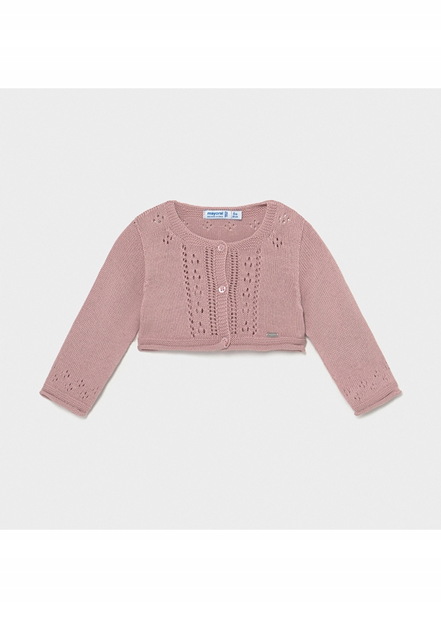 Светр з довгими рукавами для дівчаток із деталями відповідних кольорів. Круглий виріз з деталями в тон. Коротка модель болеро. Застібка на гудзики спереду. Трикотаж, ніжний і приємний на дотик. Прикраси: ажурні елементи. Гладка модель.