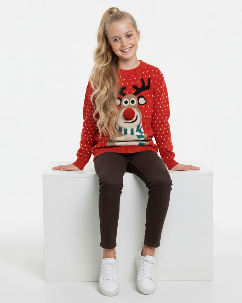 🎄 Червоний дитячий різдвяний светр з оленем і 3D помпоном - теплий, смішний і ідеальний на подарунок.