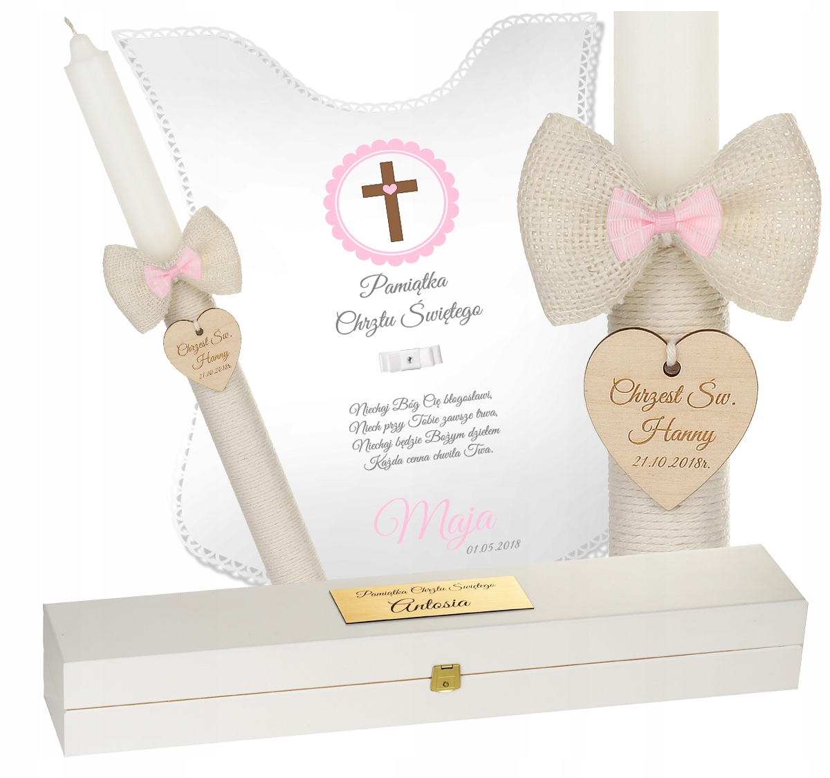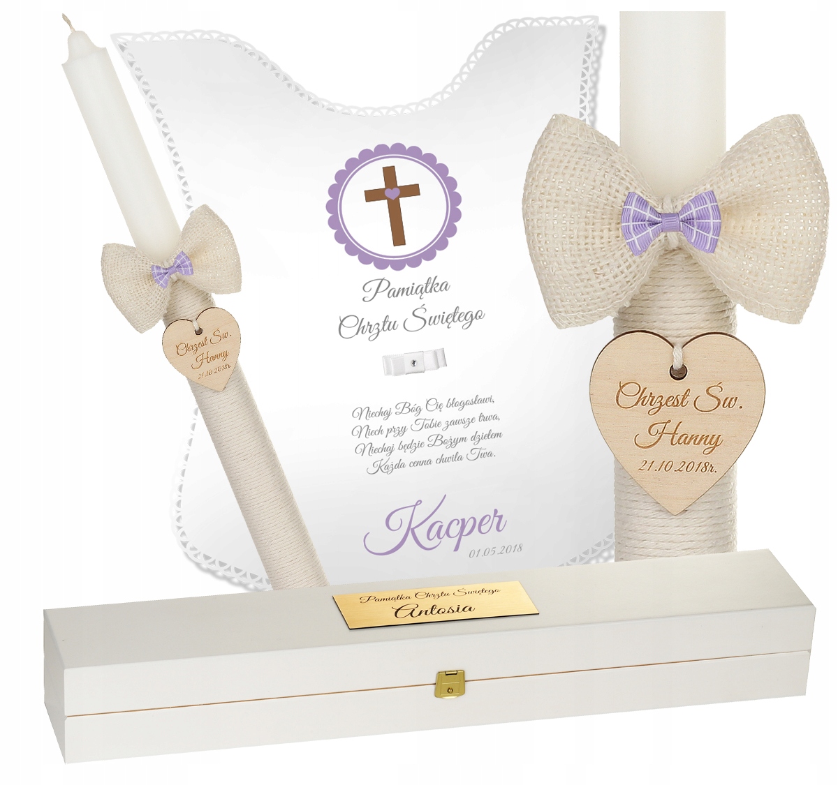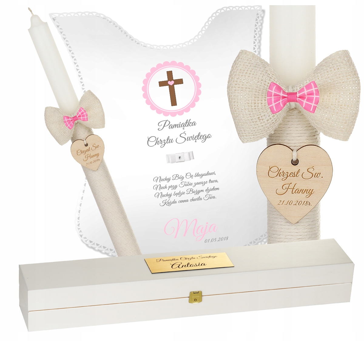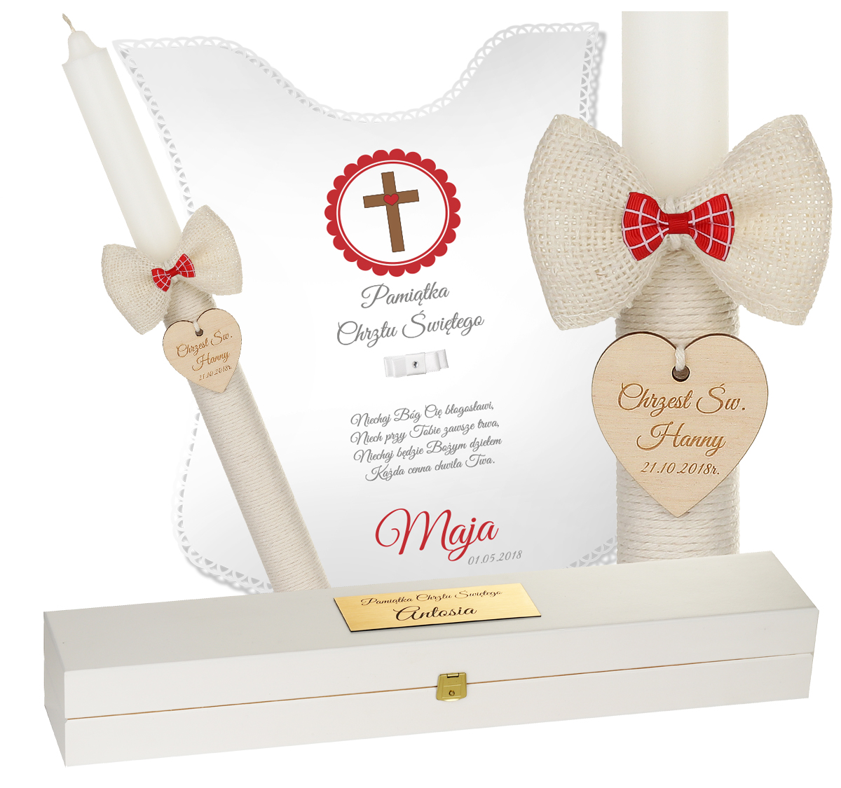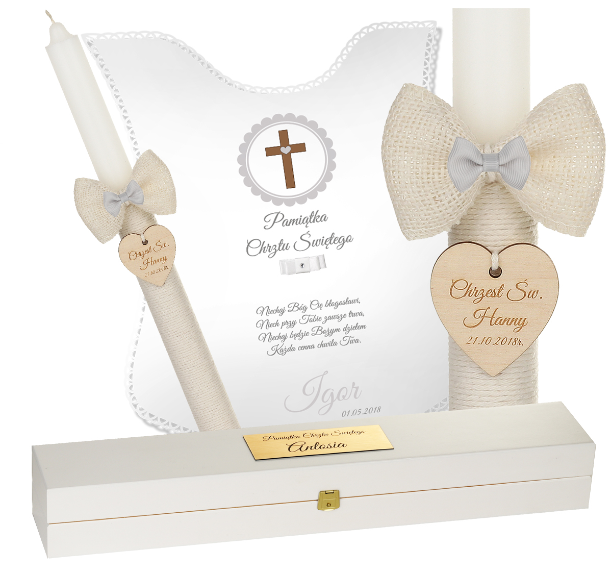 - лазерне гравірування - на свічку кріпиться дерев'яна підвіска (безкоштовно), на якій ми гравіруємо ім'я дитини та дату святкування. Ми також використовуємо лазер для точної обробки країв шматка. Для гравірування ми використовуємо новітнє обладнання від світового лідера.