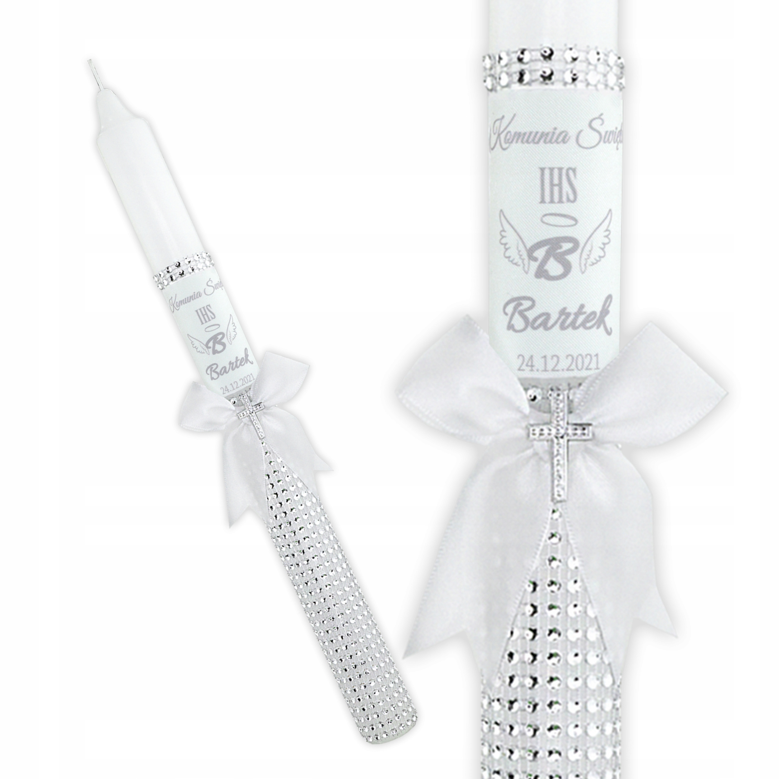 Ми створили ДІАМАНТОВУ КОЛЕКЦІЮ для клієнтів, які шукають чарівну свічку, повну блиску та елегантності. Прикрашена вручну свічка з ім'ям дитини та датою свята. Прикрашена таким чином свічка стане чудовим елементом фотографії з церемонії та чудовим сувеніром про цей особливий день.